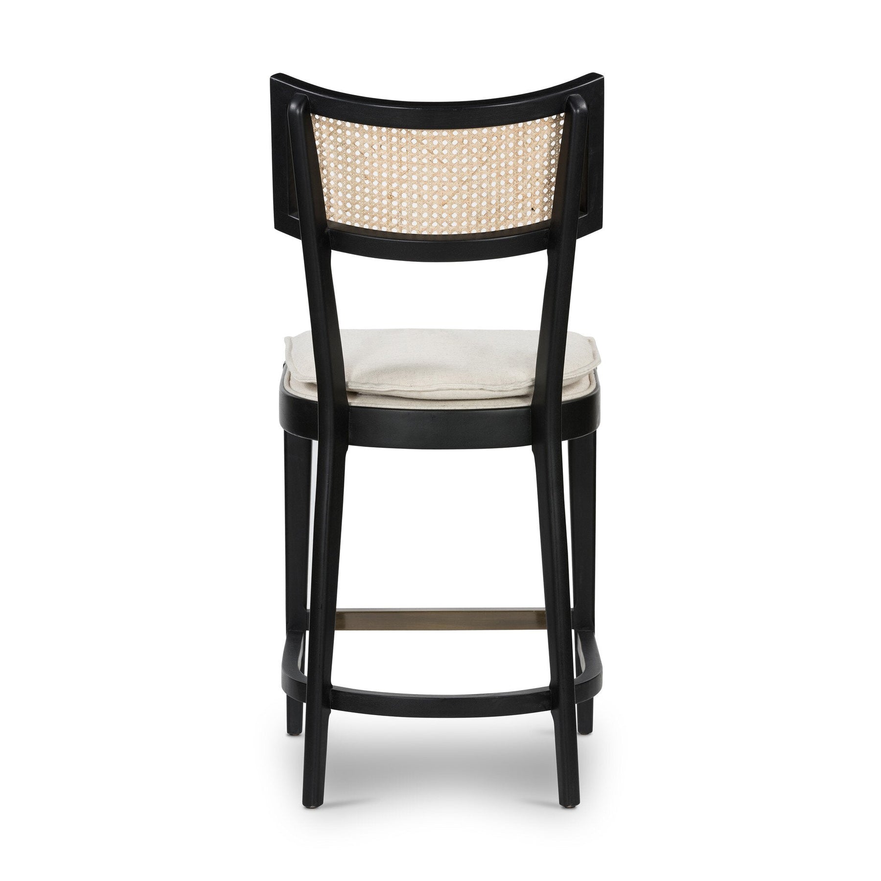 Mixed materials refresh retro styling. Brushed ebony nettlewood frames a textural inlay of natural cane for beautifully crisp contrast. Fastened by Velcro, light, linen-blend seating of high-performance fabric brings modern sensibility to the counter. Performance fabrics are specially created to withstand spills, stains, high traffic and wear, ensuring long-term comfort and unmatched durability.