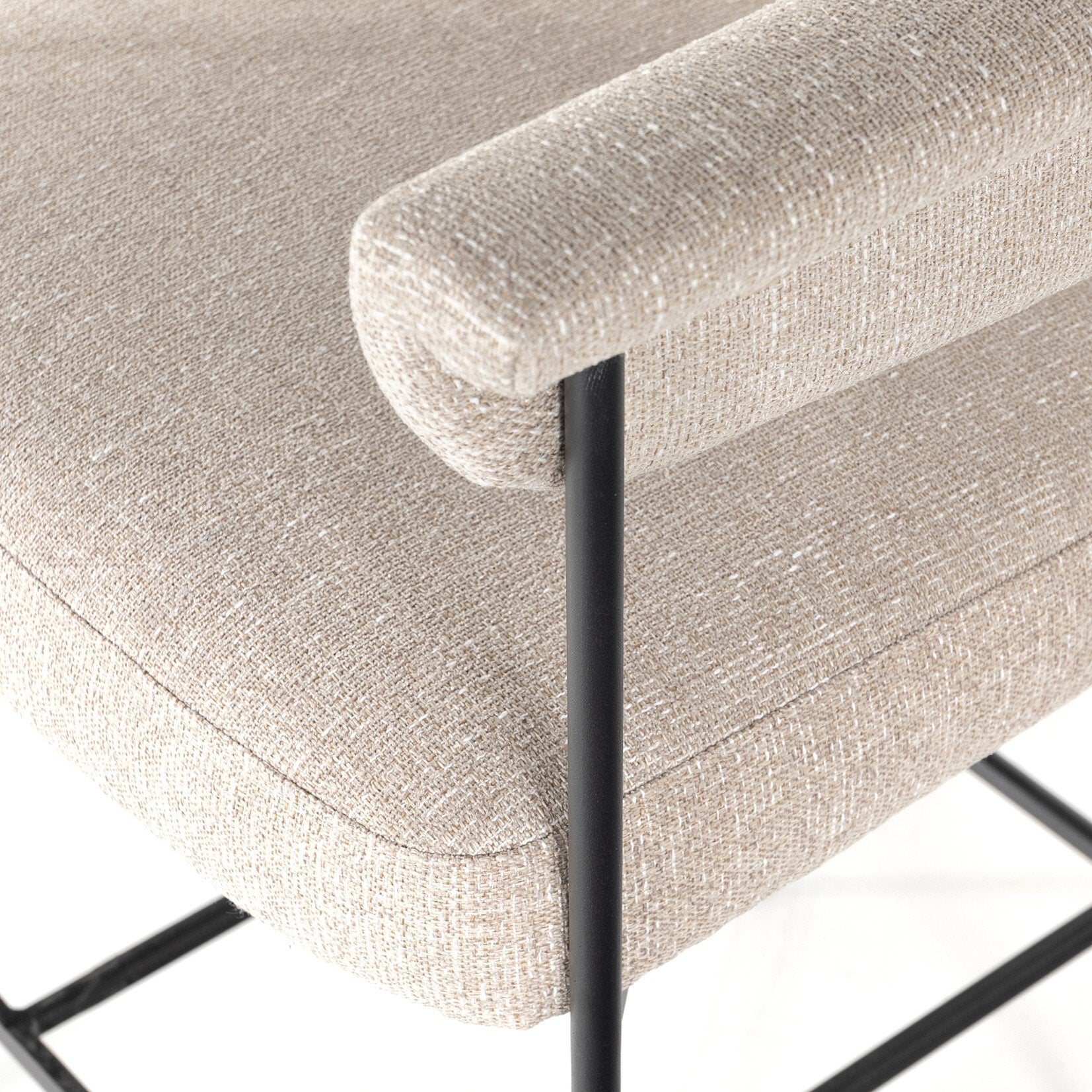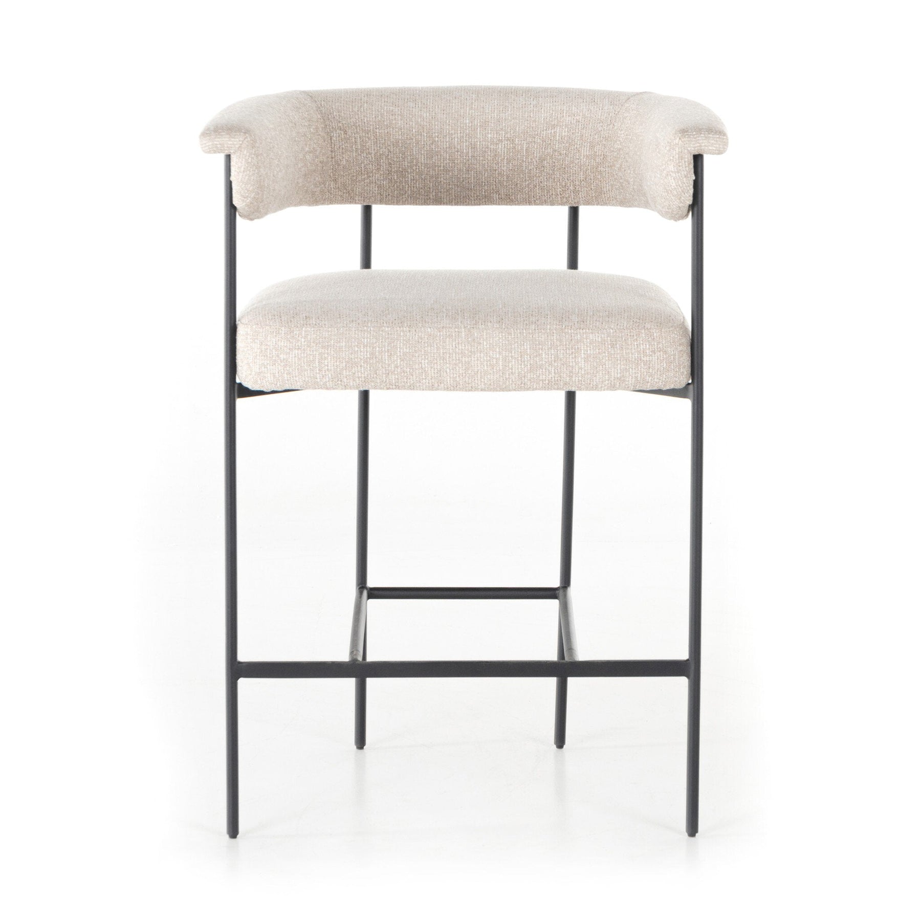 Airy and light with slim, black-finished iron framing, camel-colored upholstery lends texture to a beautifully sculpted counter stool style featuring a yoke back and exterior fold detailing.