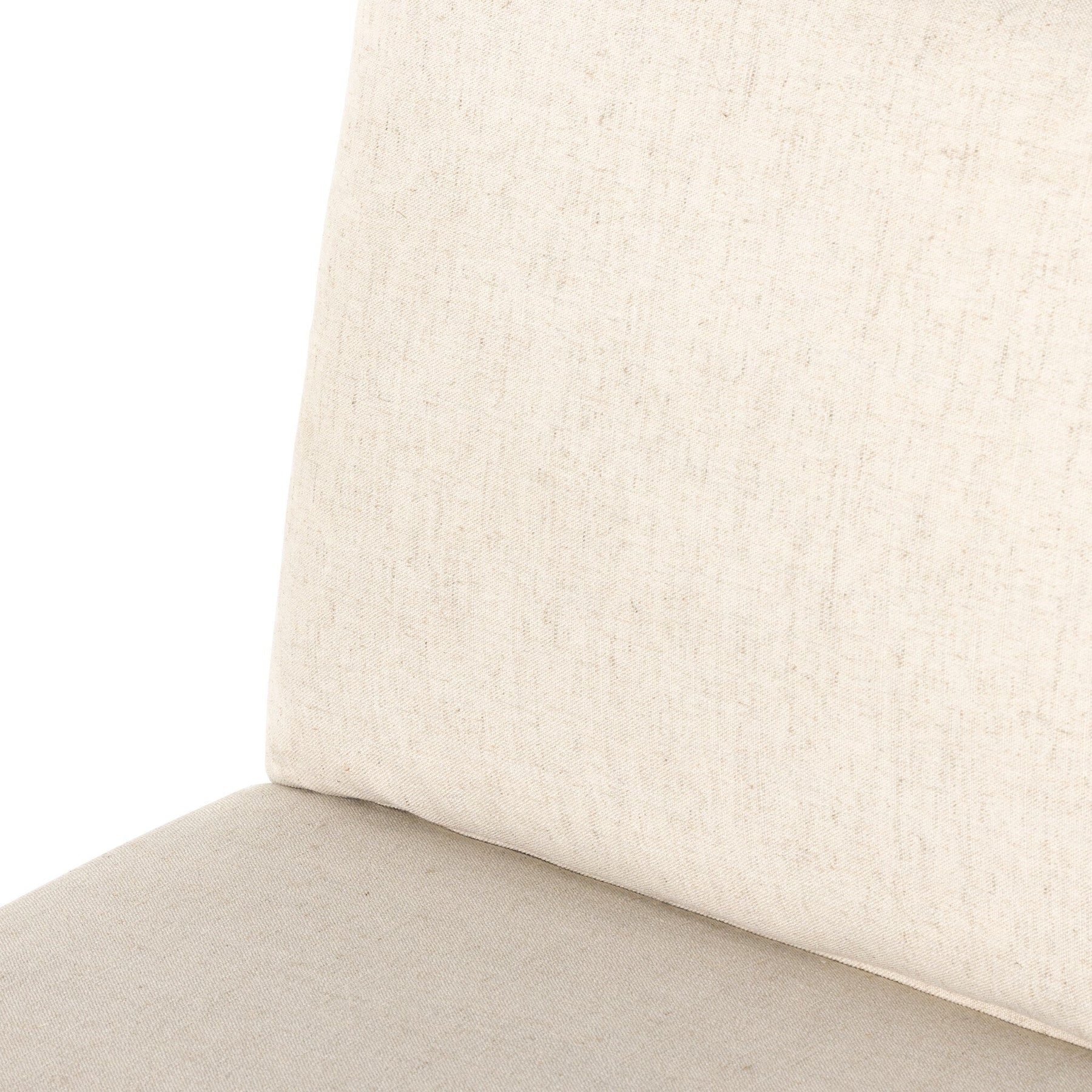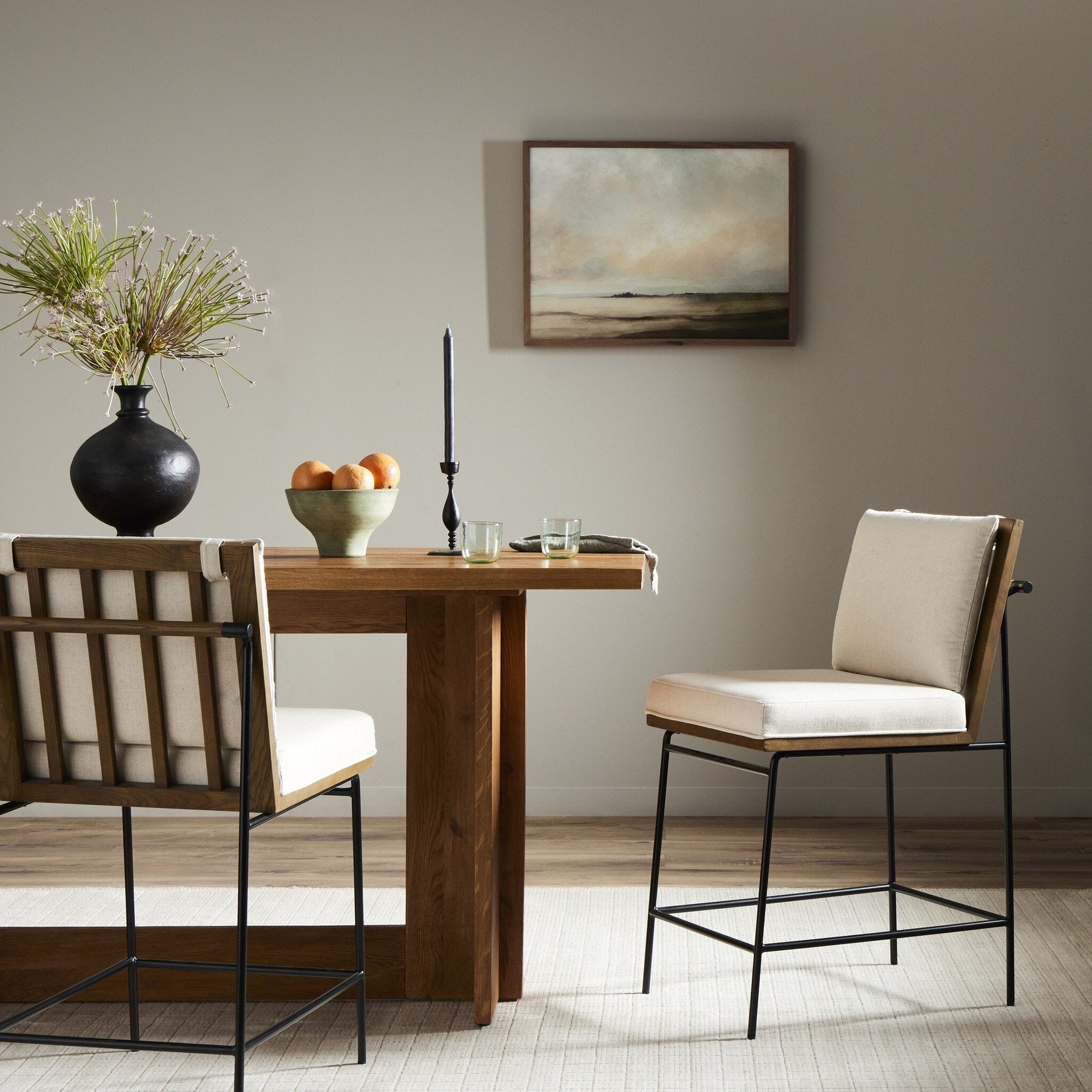 Crisp and clean, with natural panache. Slim, black-finished iron frames a floating ladderback of honey-finished oak and cream-colored high-performance seating. Rear handle detail adds a fashionable finishing touch. Performance fabrics are specially created to withstand spills, stains, high traffic and wear, ensuring long-term comfort and unmatched durability.