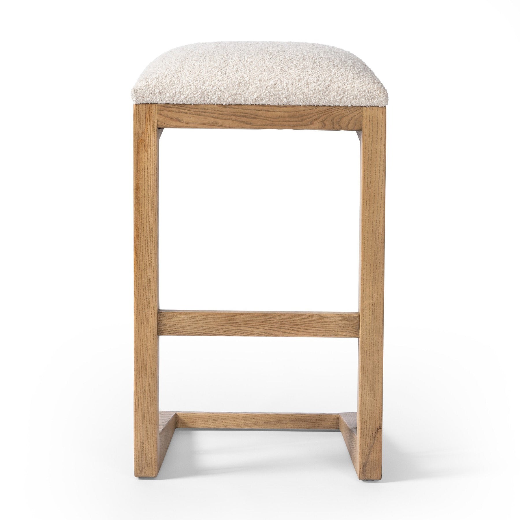 A stunner from every angle, this architecturally inspired bar stool features an angular base crafted from solid ash with two iron rods for added support and visual interest. Seat is upholstered in a linen/cotton/poly blend performance fabric with subtle texture throughout. Performance fabrics are specially created to withstand spills, stains, high traffic and wear, ensuring long-term comfort and unmatched durability.