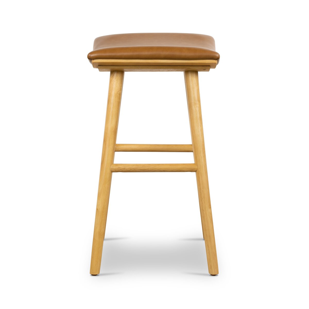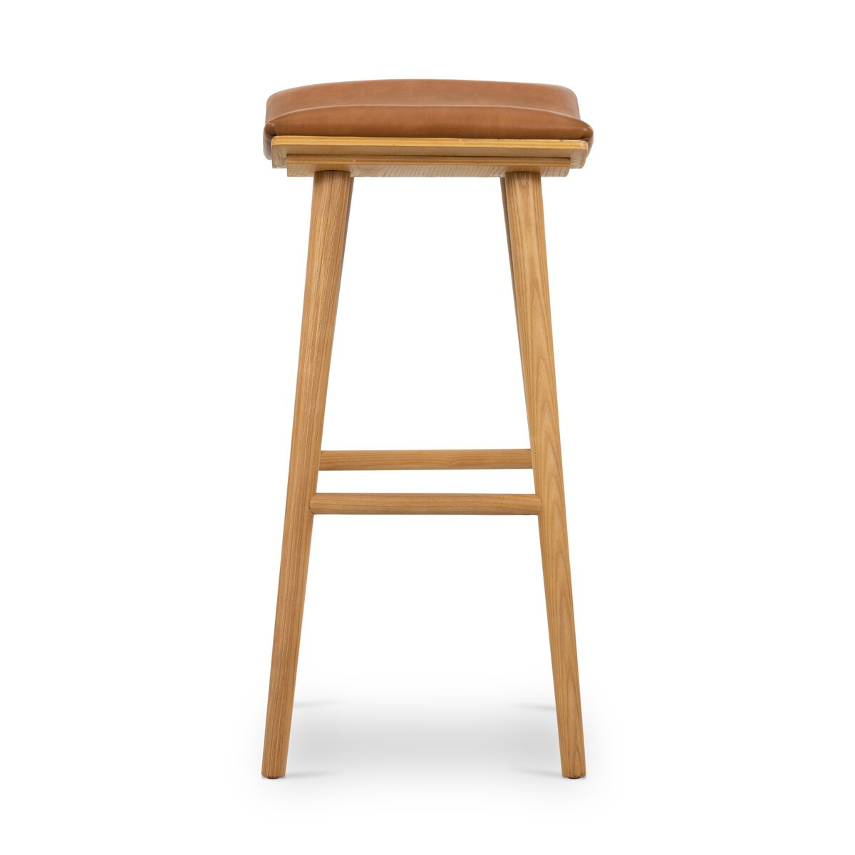 Slim and straightforward, while not short on impact. Smoked natural parawood frames a saddle-style seat of faux butterscotch leather. Perfectly sized for the bar.