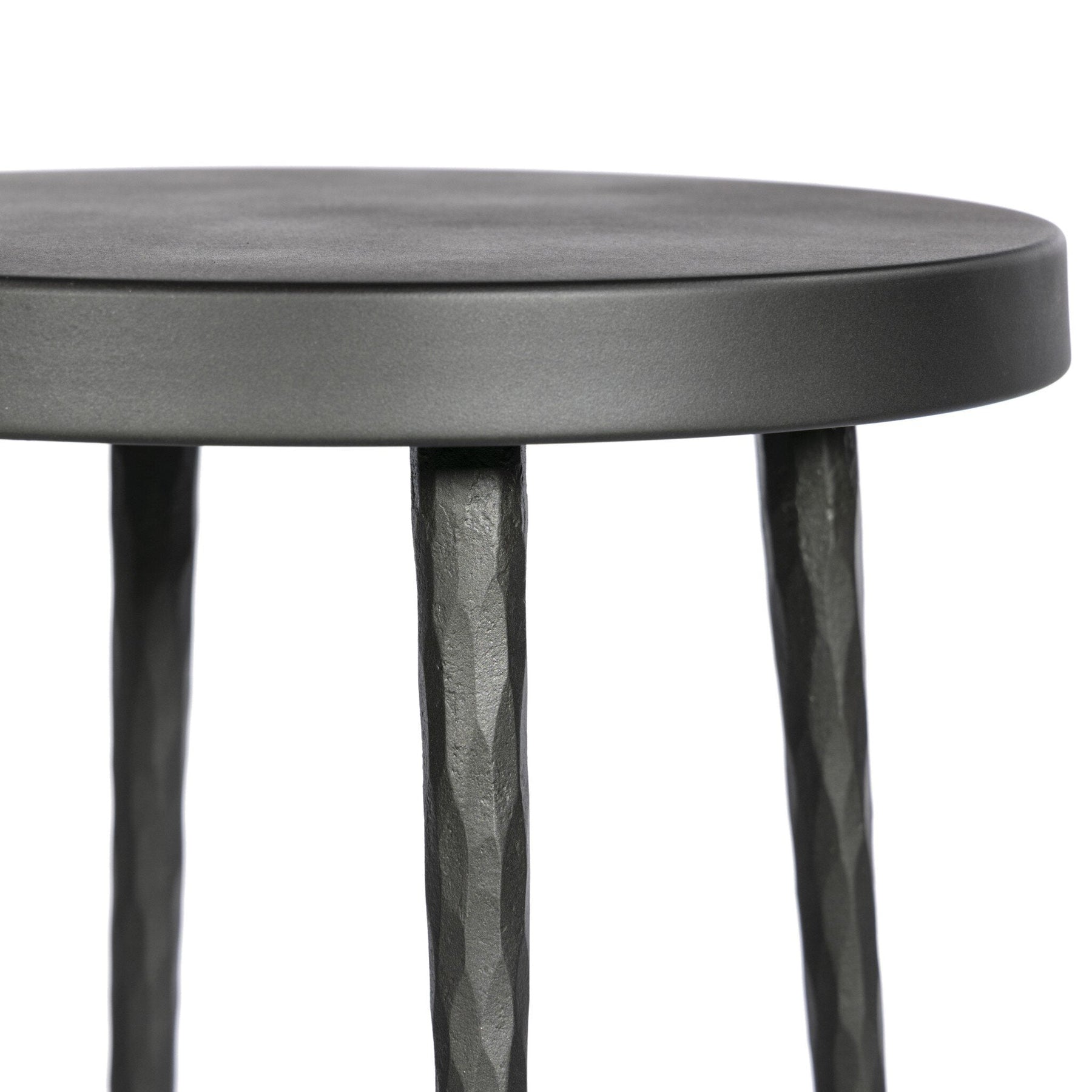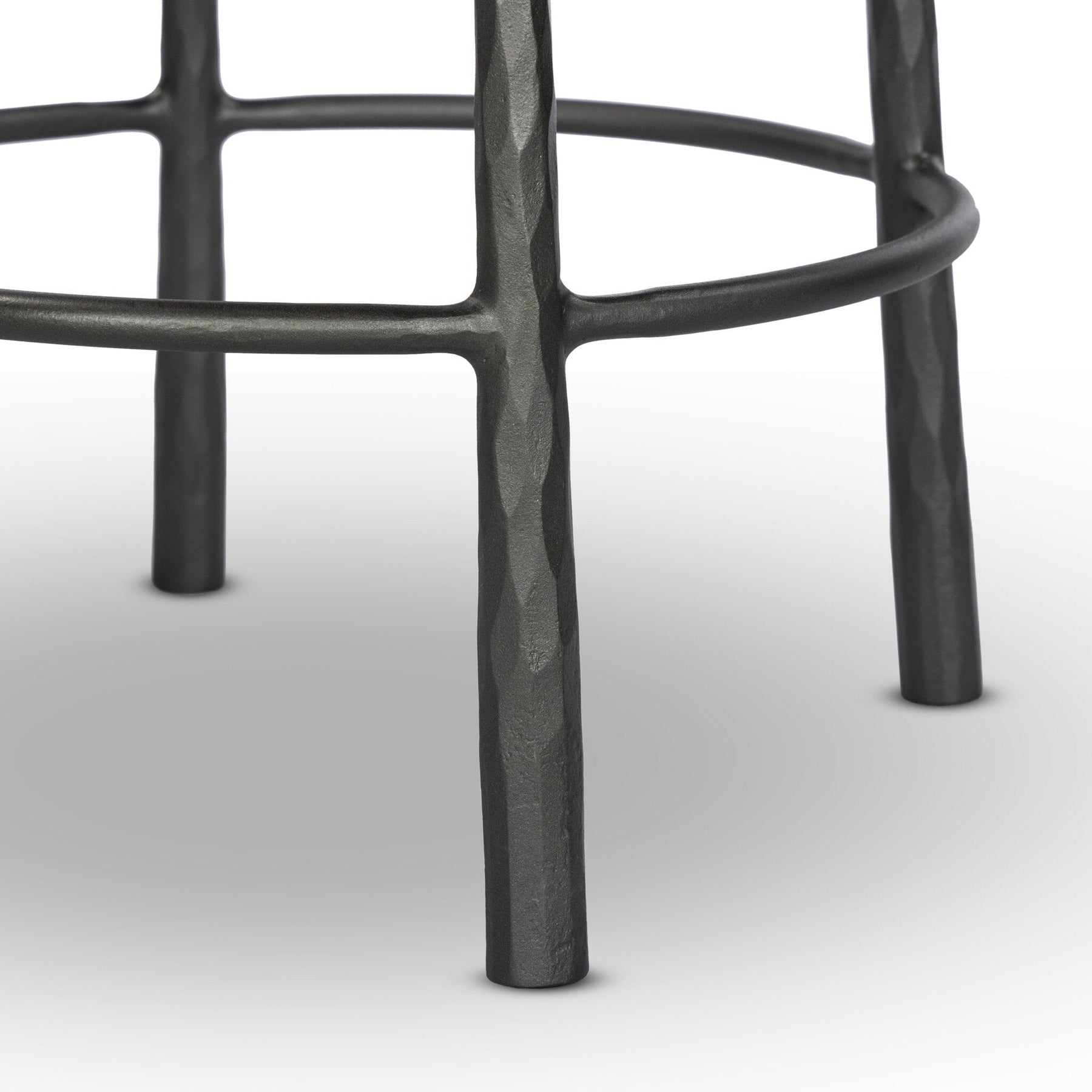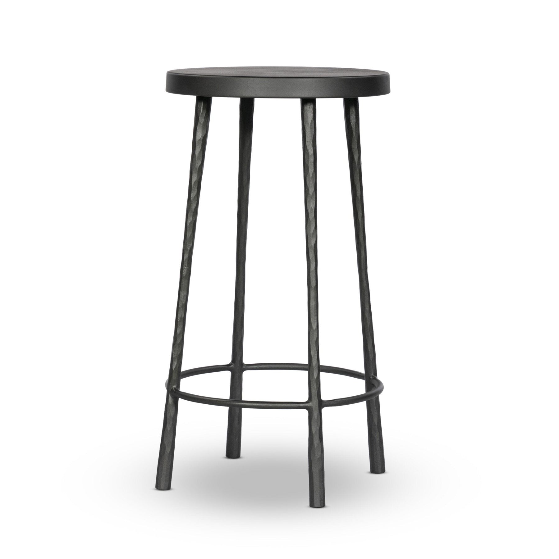 Primitive inspiration leads to a hand-crafted look. Gunmetal-finished iron is hammered and hand-wrought for rich, rough texture that offsets this stool's slender form. Perfect paired or in multiples.