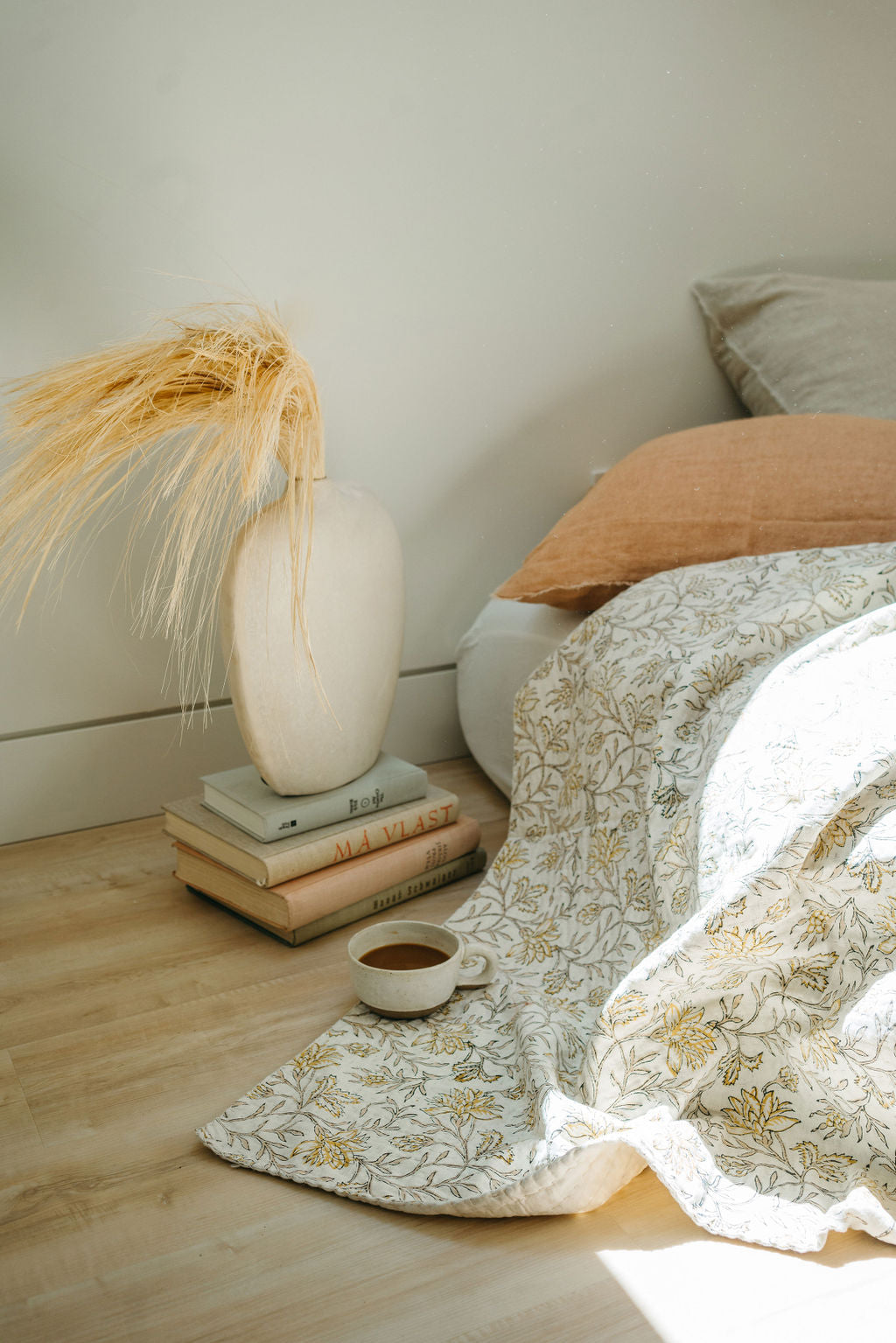 The Carolina Block Print Bed Quilt features hand block printed florals with subtle stripes of traditional kantha. Many hands and hearts go into bringing this timeless textile to life. It all begins with carving the designs into wooden blocks, a process that is itself an art form. From there, the blocks are dipped in dye and meticulously stamped onto fabric to create beautiful repeat patterns. Long lines of hand kantha stitching is later done with love by women in their home villages to give our signature quilted feel. Bringing brightness and optimism, we love the summery feel this blanket brings to a space. Dry Clean Only.