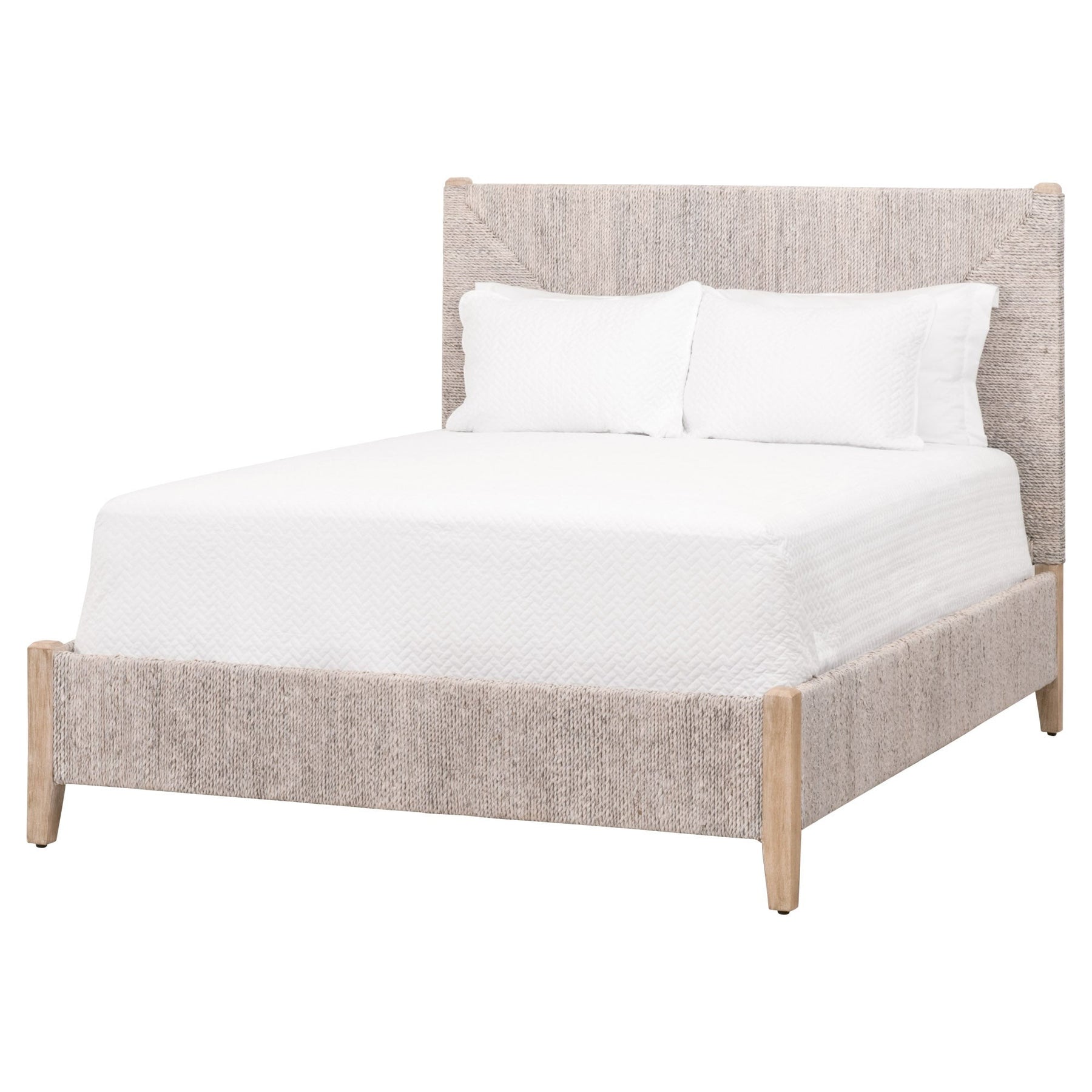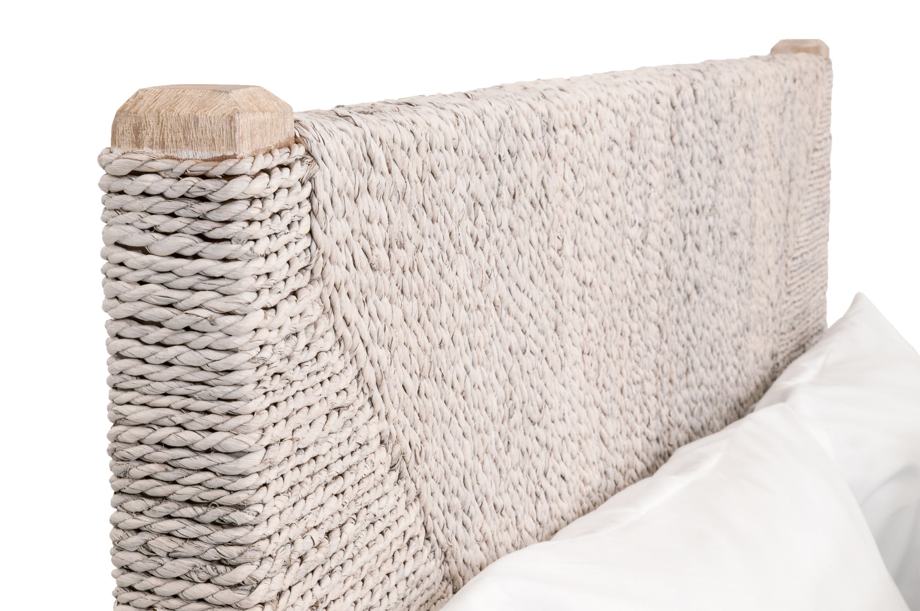 Effortlessly enhance your bedroom with the captivating Malay Standard King Bed by Essentials For Living. Showcasing a mix of coastal, bohemian, and transitional designs, the frame features a hand-woven, natural abaca rope with a whitewash finish, beautifully complemented by a natural gray mahogany frame. Measuring 81.25" wide, 87.25" deep, and 54" high, this bed is set to hold a standard king-sized mattress. The unique bed frame is not only visually appealing, but also easy to assemble without the need for tools. The height is adjustable with its removable wood cross bars (4 included). The bed frame is also designed to accommodate either a box spring or bunkie board foundation. Please note that slats are not included. Transform your bedroom into a serene retreat with this exquisite piece.