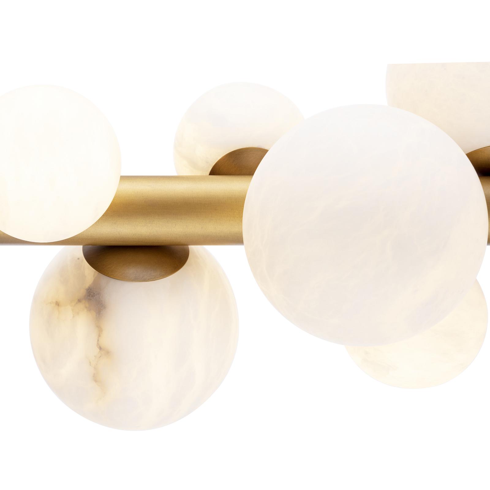 Natural alabaster stone orbs dance around a metal base, adding a spectacular sculptural element to your home. The Styx Chandelier is elegant and modern. When illuminated, it has a special ambiance that only alabaster can create. Add this chandelier to a dining room or living space deserving of a modern statement.