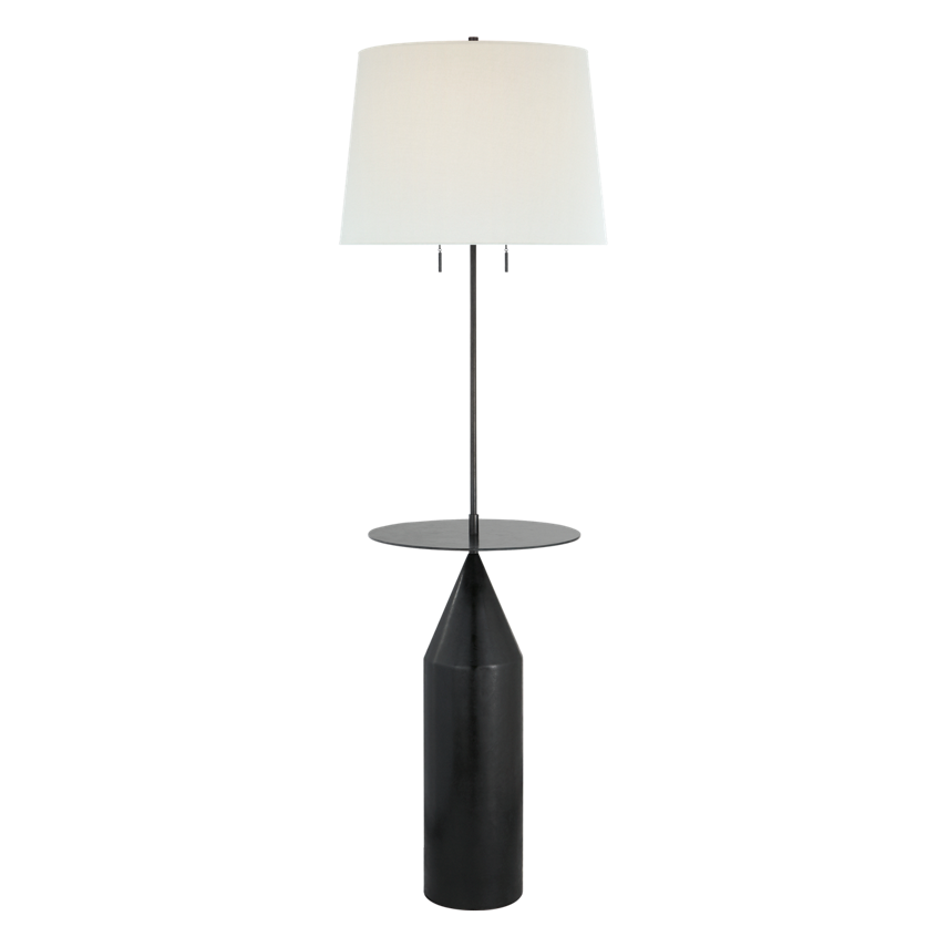The Zephyr Large Floor Lamp features an aged iron finish paired with a generous linen shade. Its base doubles as an end table, offering a versatile and practical design. Combining innovation with elegance, this lamp serves both as a stylish lighting solution and a functional piece of furniture.