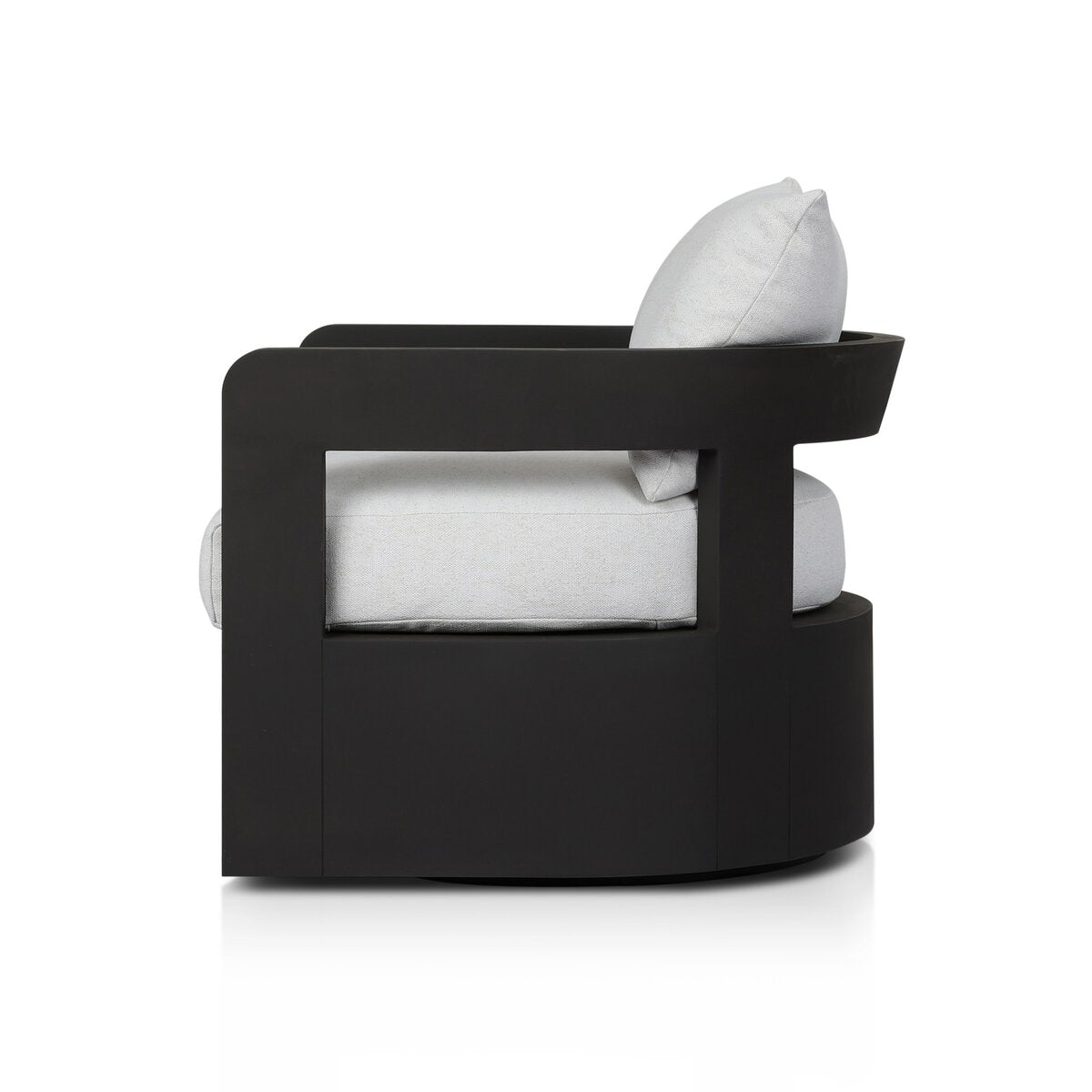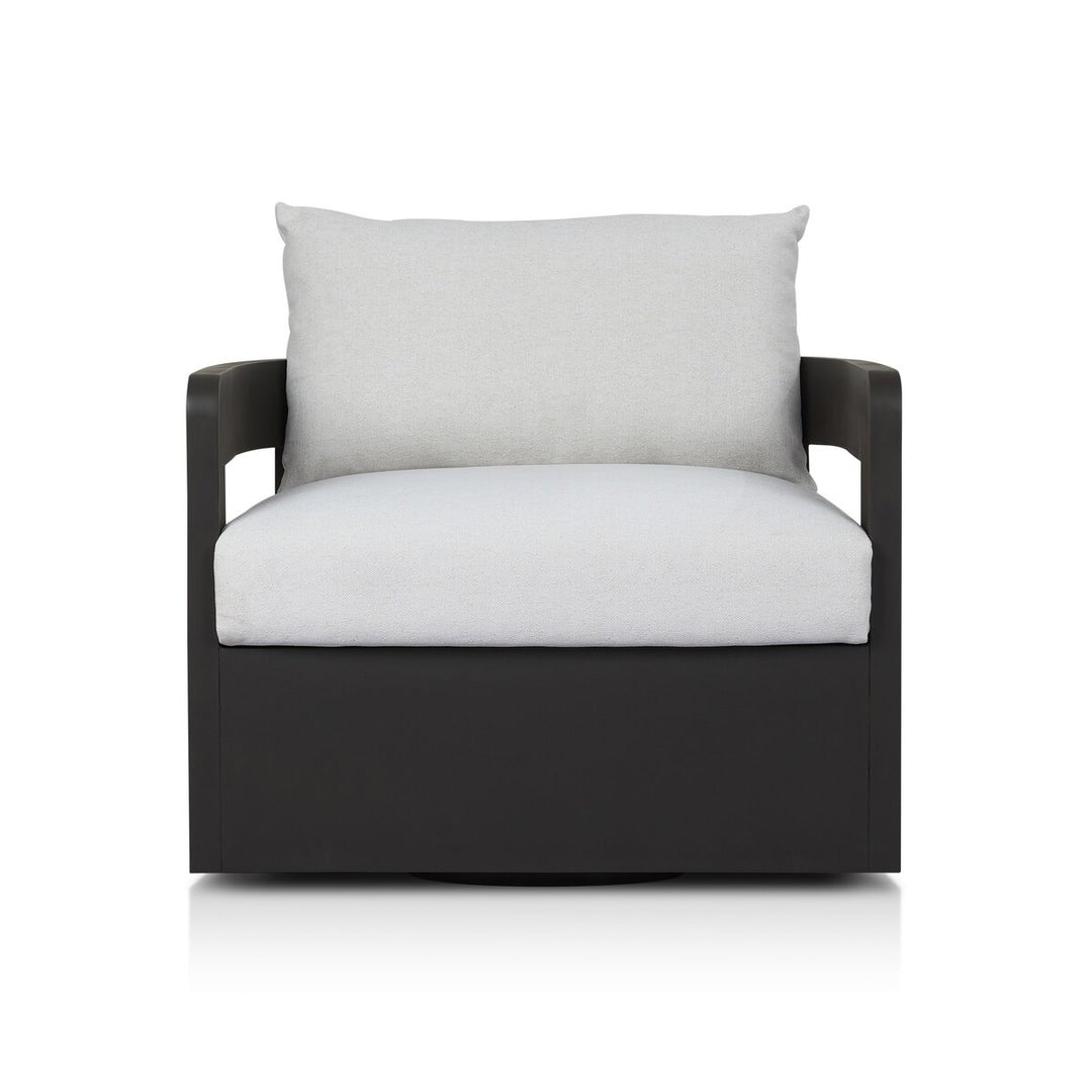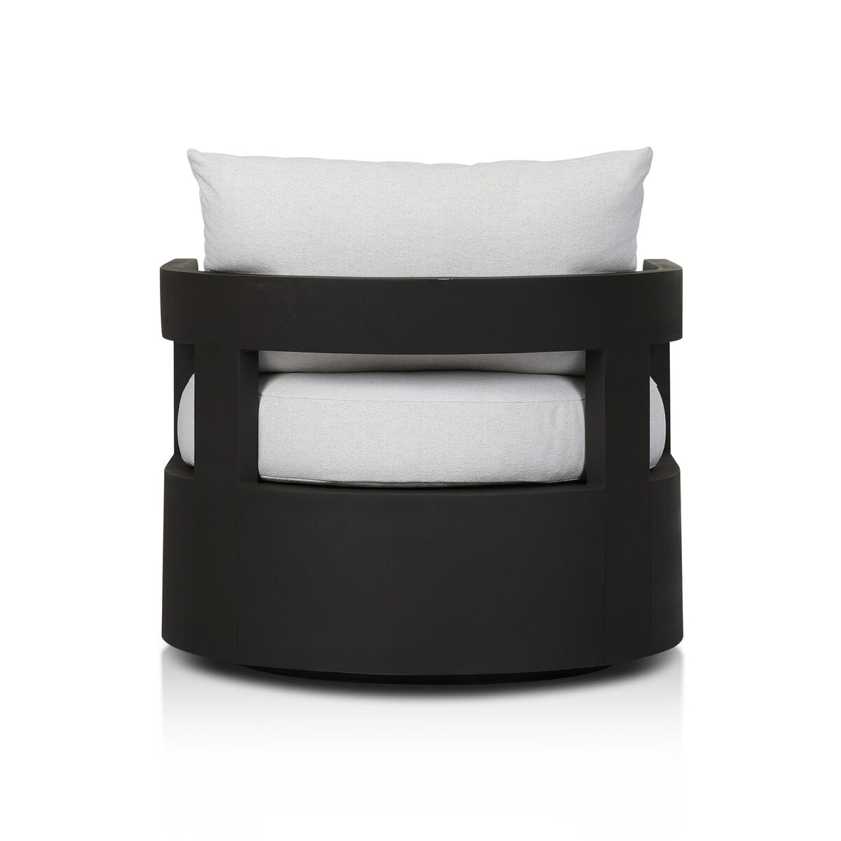 Crisp upholstery and metal framing form a simple barrel back outdoor chair with a 360 swivel, complemented by softened edges and a fluid shape for a classic look. Cover or store inside during inclement weather and when not in use.