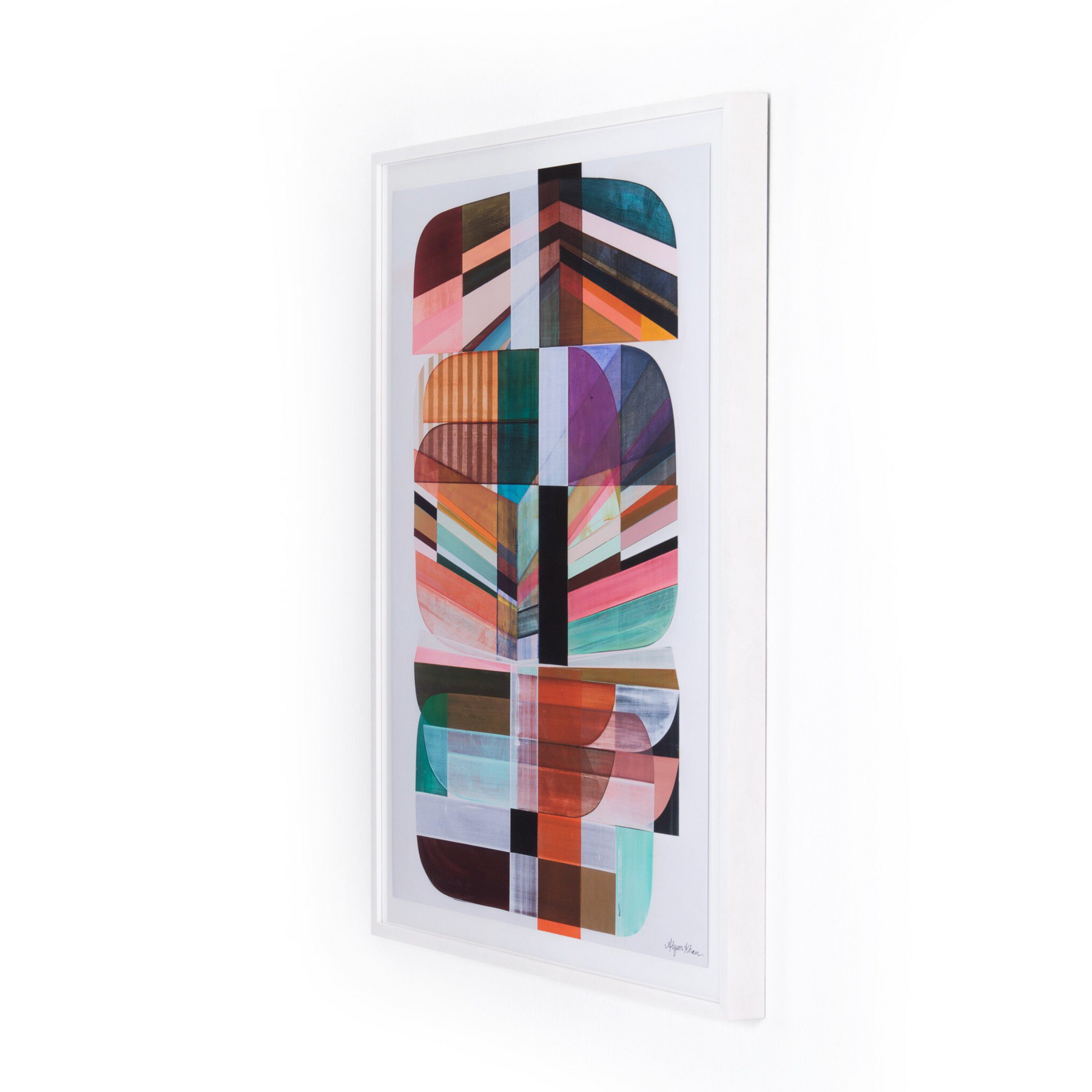A colorfully complex, shape-driven rendering by Denver-based artist Alyson Khan is printed on watercolor paper and framed within white-washed maple for a gallery-quality look. Handmade in Austin, Texas.