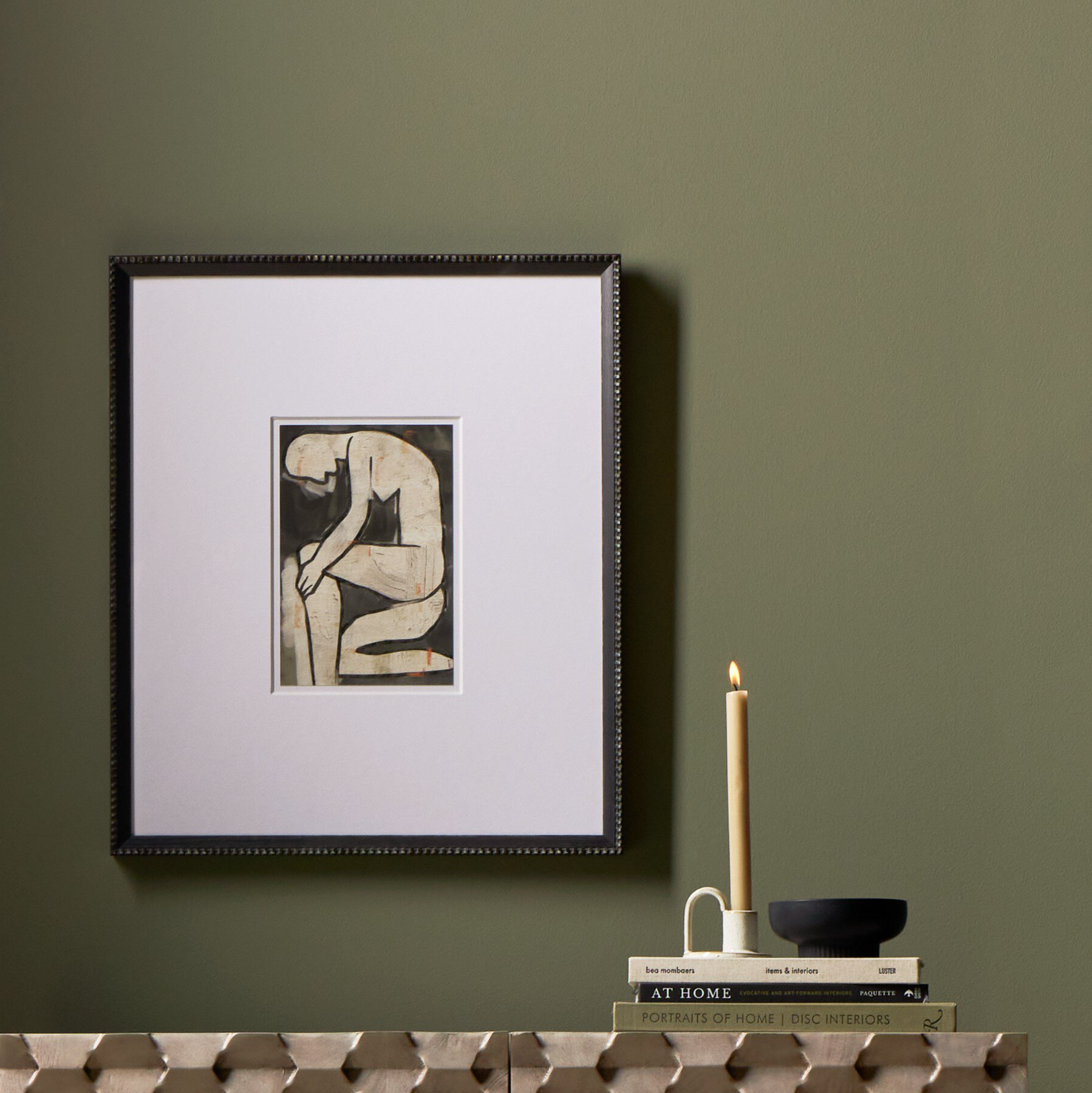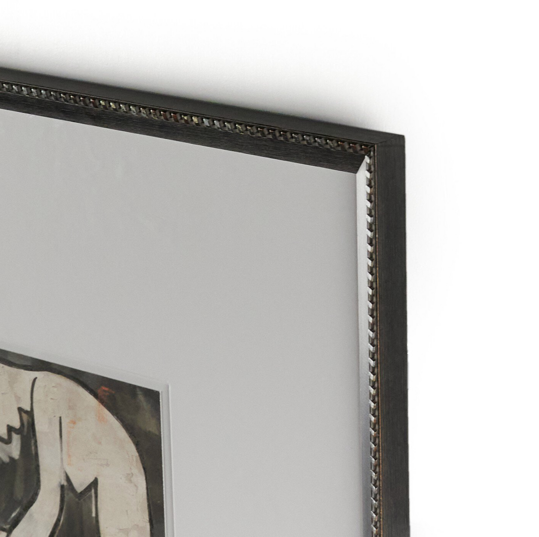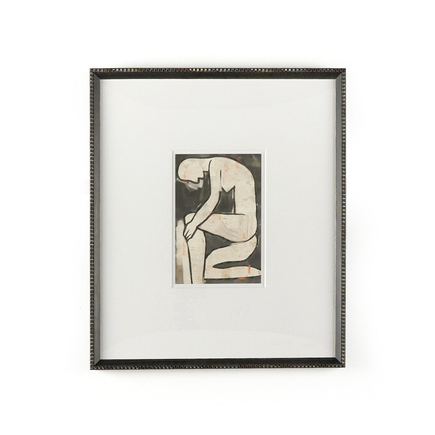An abstract figural capsule, reminiscent of traditional block printmaking methods and accented by a textural frame, from Bangkok-based art house Coup D'Esprit. Finished within a decorative Brimfield black frame of naturally distressed painted pine. If not currently in stock, this texture-enhanced piece ships within three weeks. Handmade in Austin, Texas.
