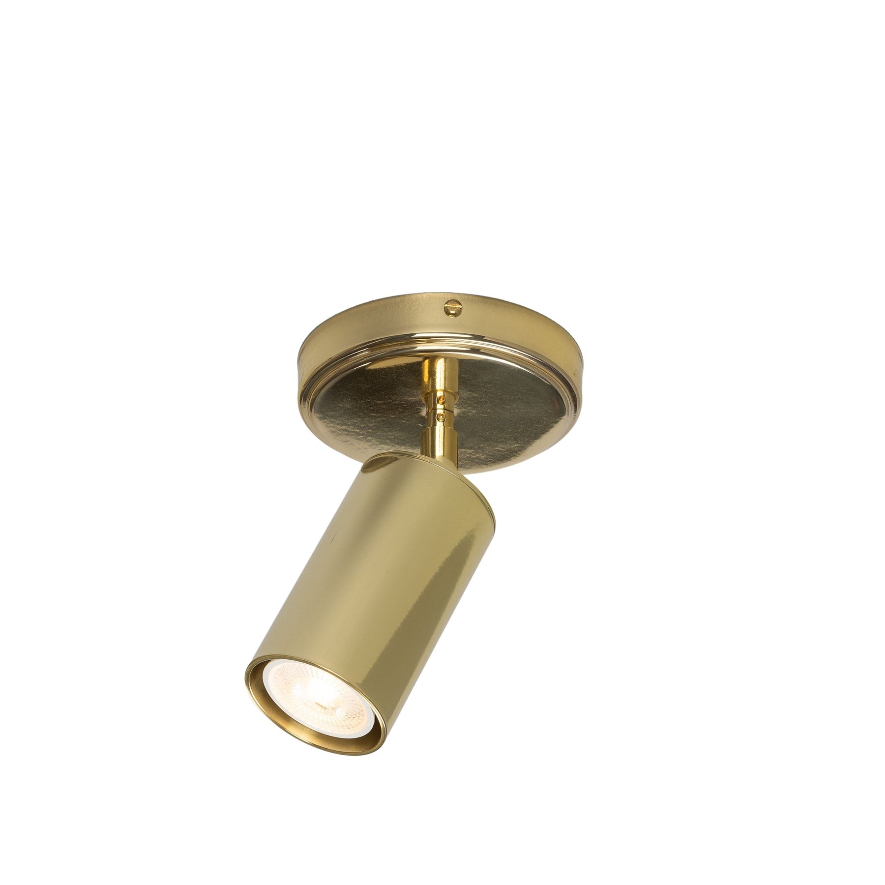 A short brass sleeve descends from its ceiling rose, connecting to a cylindrical brass body. This cylindrical brass body can be rotated in any direction.