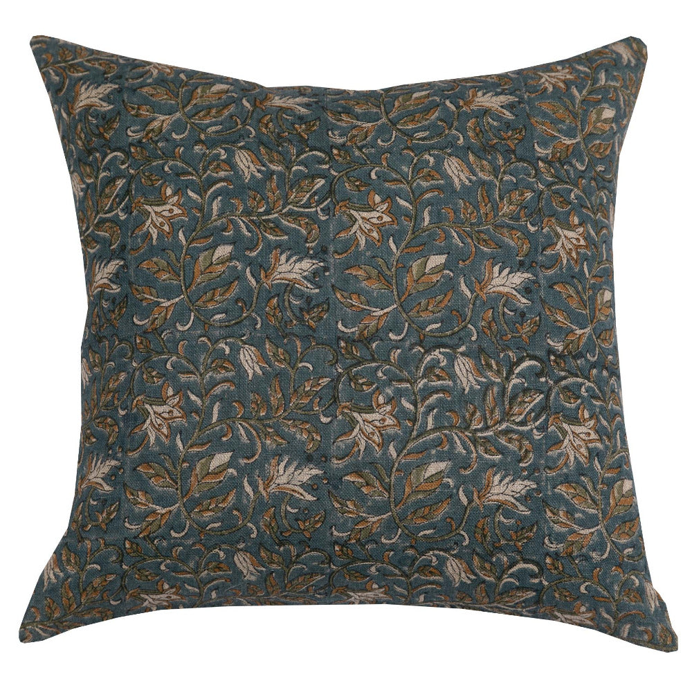 The Calluna Pillow presents an intricate floral pattern in a rich deep teal, complemented by mustard and olive accents, all skillfully block-printed onto luxurious linen fabric.