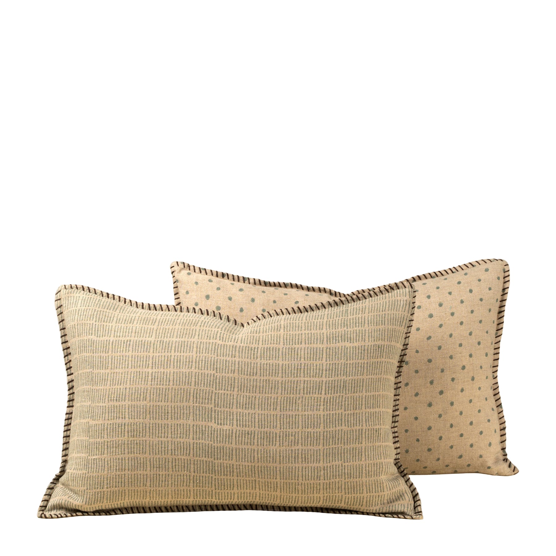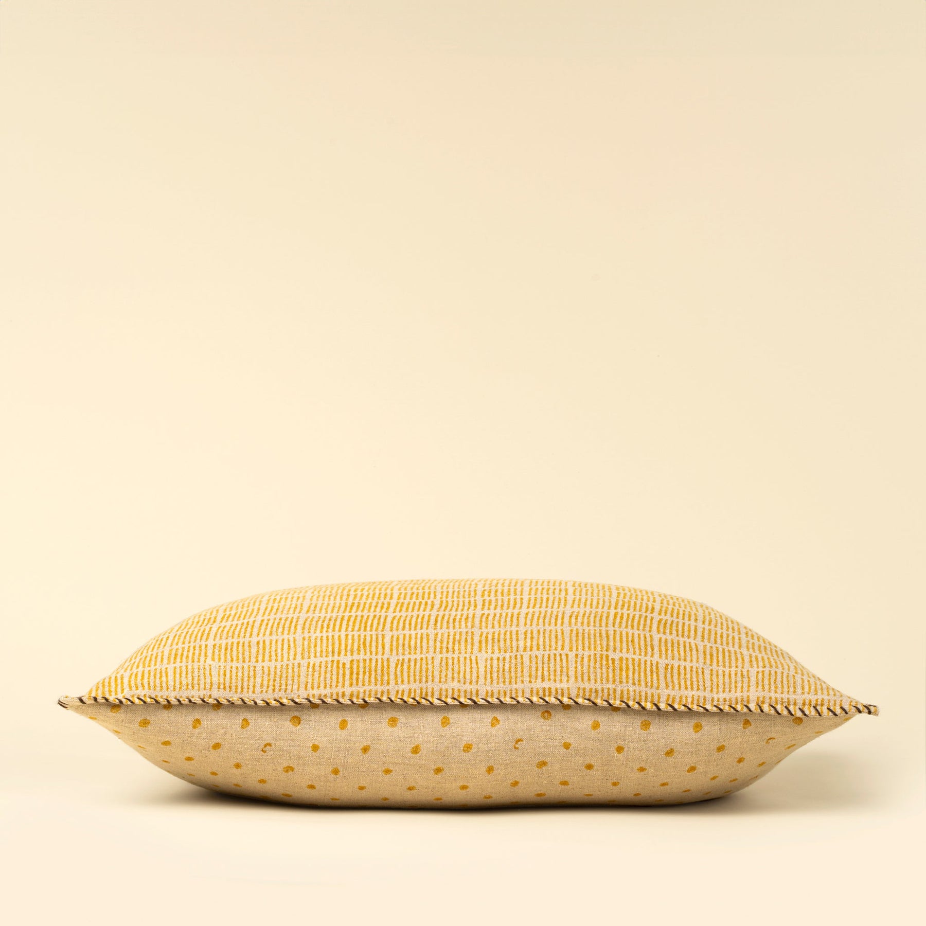 Add a touch of whimsy to your space with the Dash & Dot Linen Pillow. This modern decorative pillow is hand block printed on 100% Belgian linen, featuring a dash pattern on one side and polka dots on the other, both in rich yellow hues on a natural linen background. Finished with dark brown blanket stitching, it’s a thoughtful nod to traditional craftsmanship and ethical sourcing.