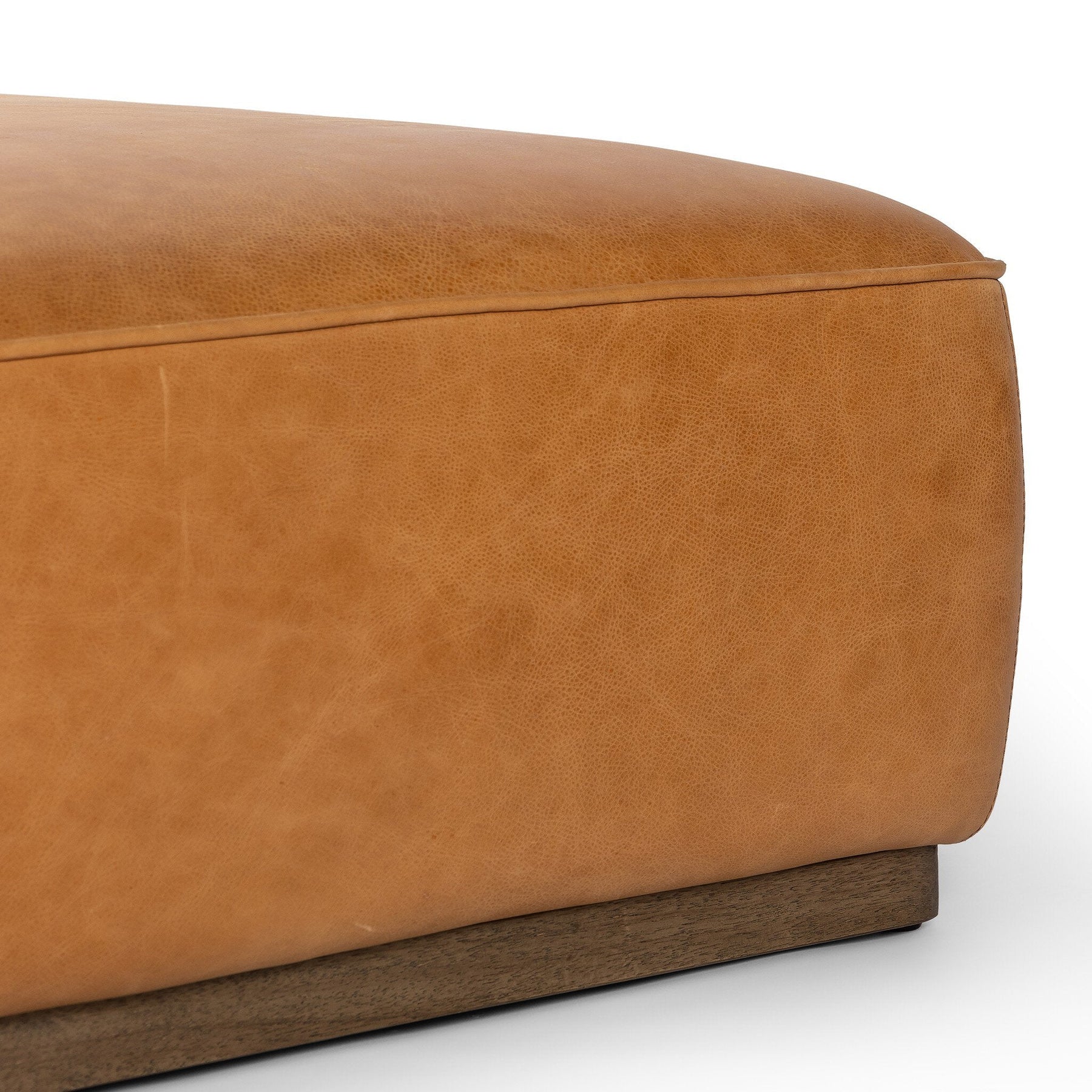 Upholstered in rich top-grain leather with a visible grain and paired with a subtly distressed parawood base, this large, rectangular ottoman brings a hip retro vibe. Style with a tray as a design-forward coffee table.
