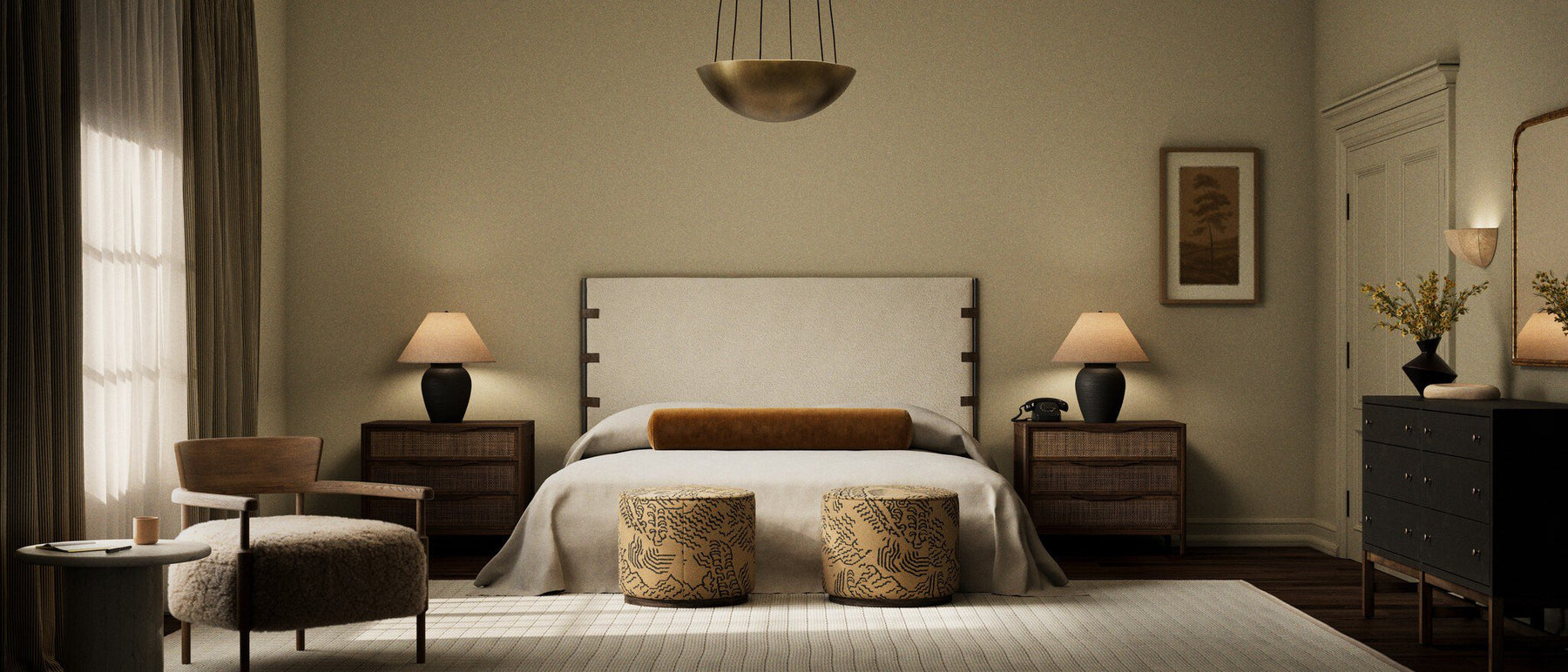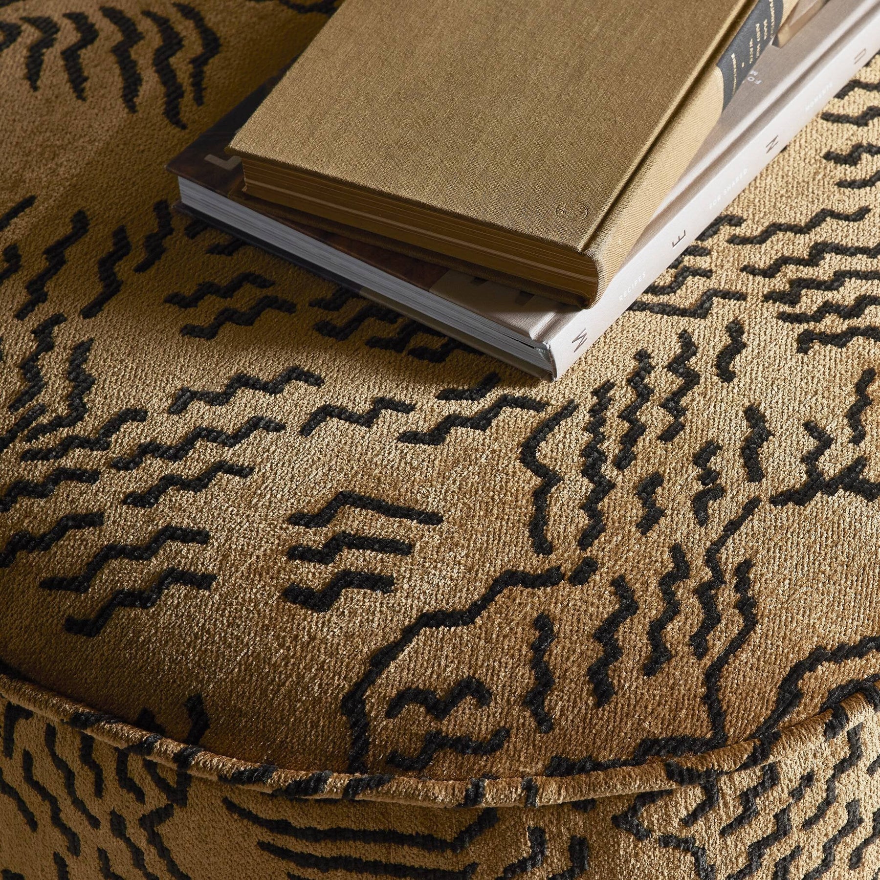 Place this round ottoman just about anywhere. Upholstered in an abstract, Tibetan-inspired landscape motif, woven from soft chenille yarns with subtle texture for added depth, dimension and drama.