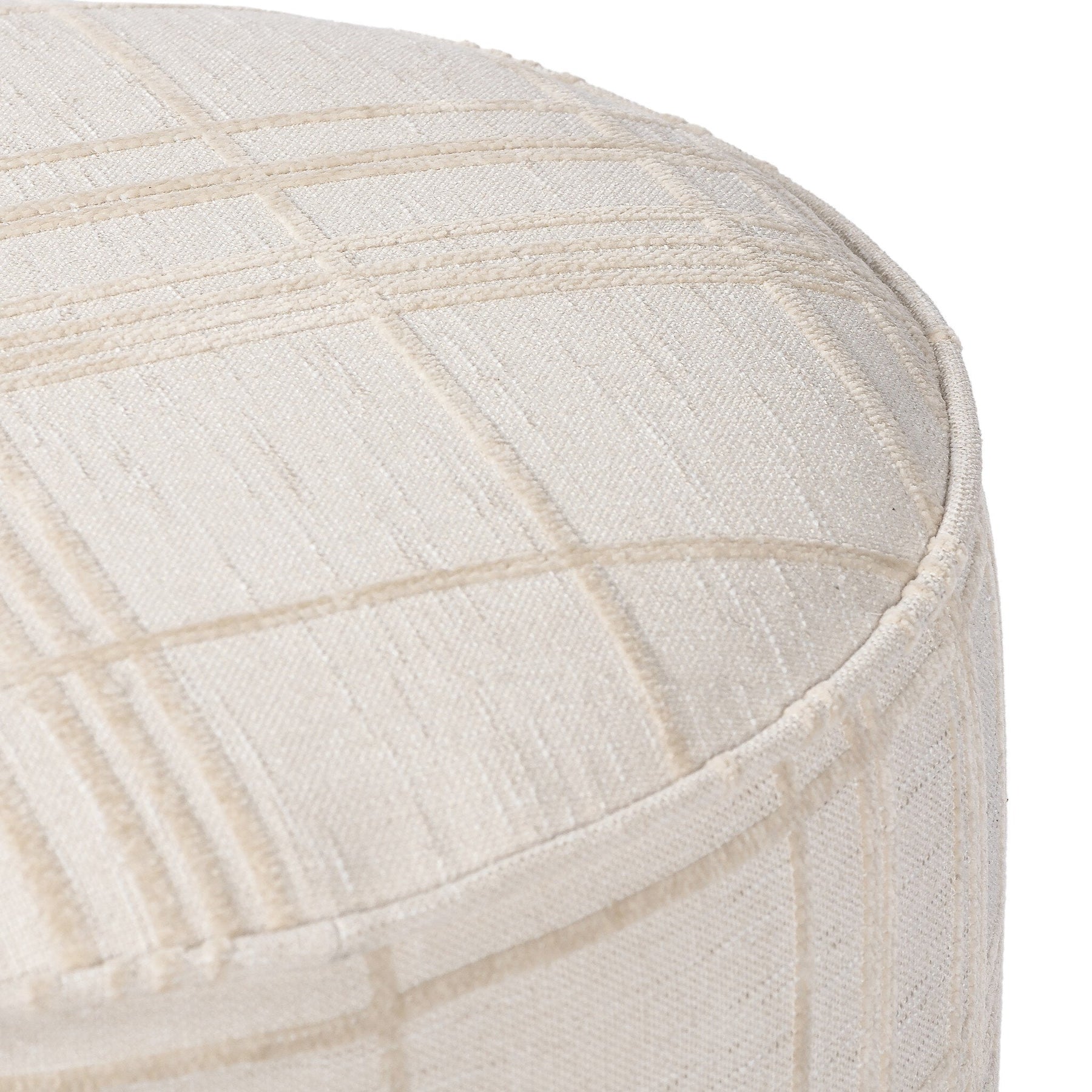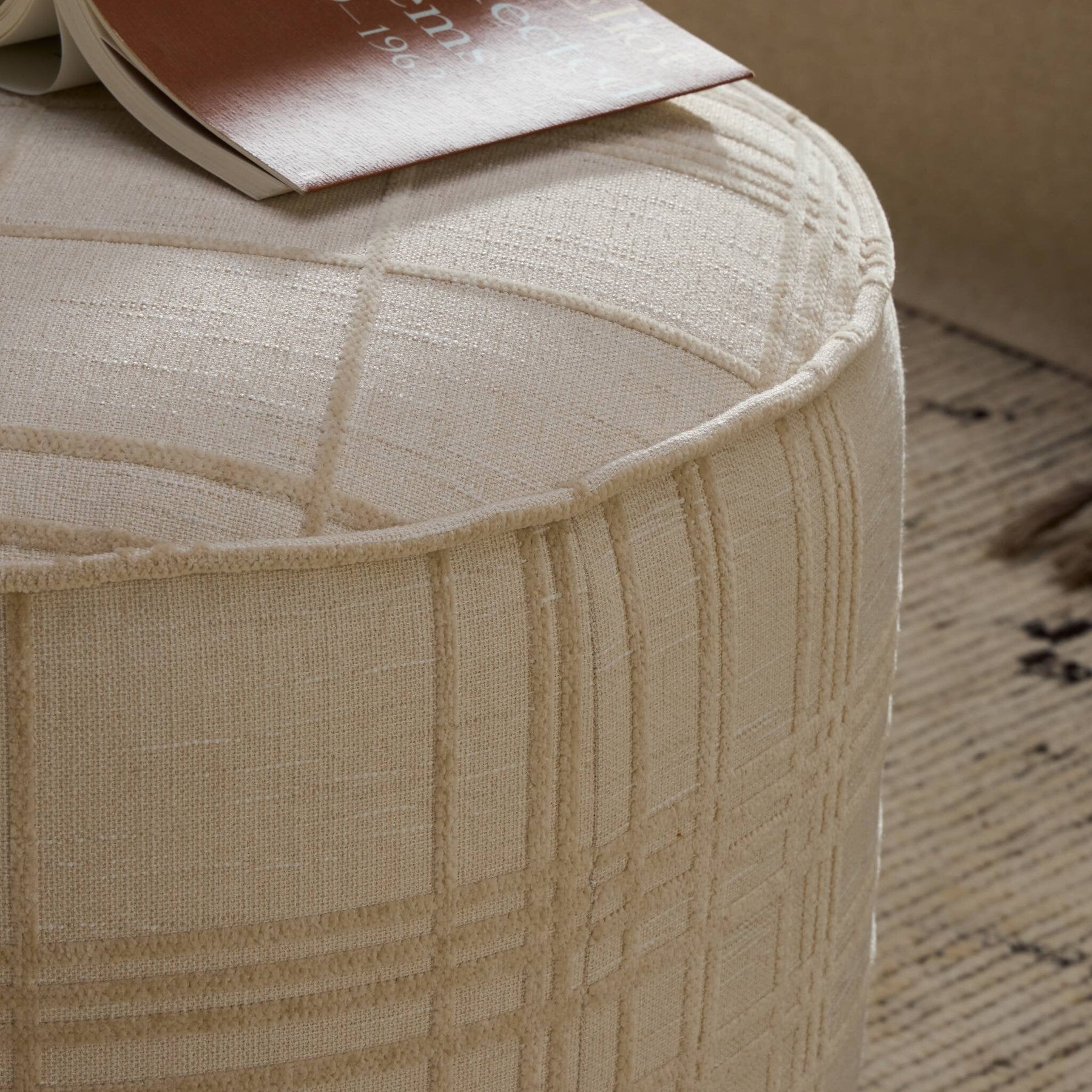 This round ottoman upholstered in traditional ivory fabric with a classic box print can be placed just about anywhere, bringing with it a polished vibe.