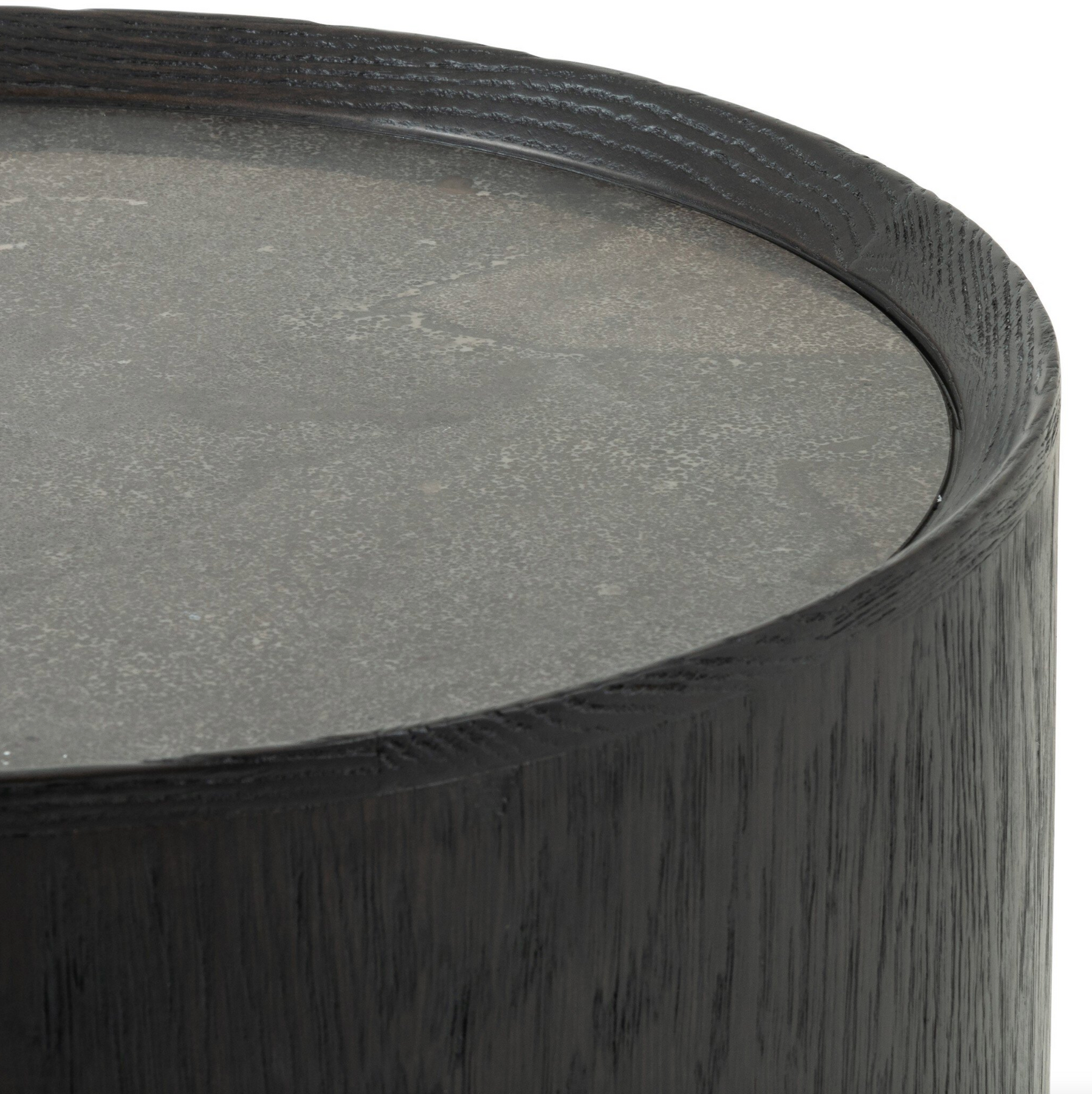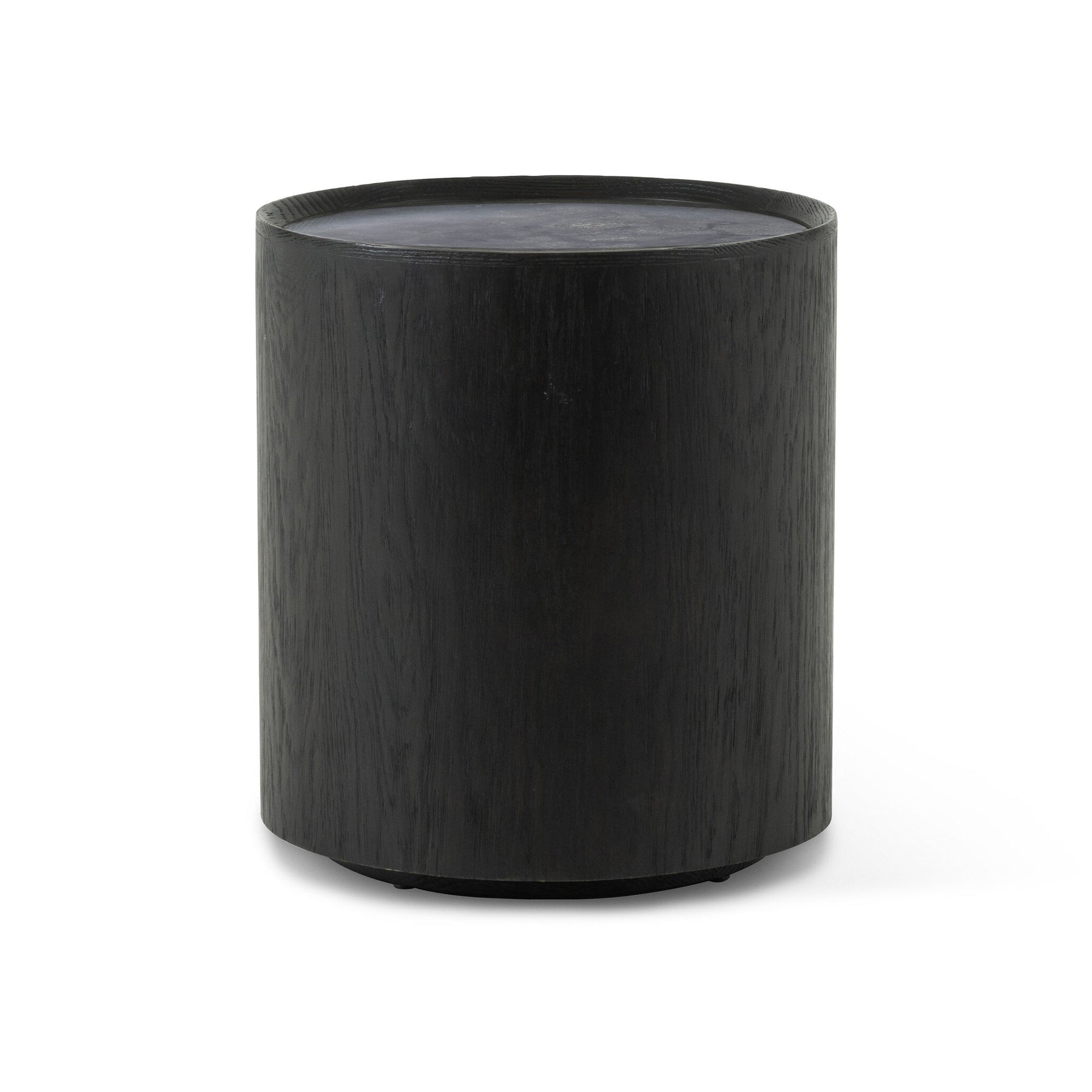 Drum-style end table of ebony-finished oak with a beautiful bluestone top. White mineral lines and subtle color, texture and pattern variations are to be expected and speak to each stone's individual nature.