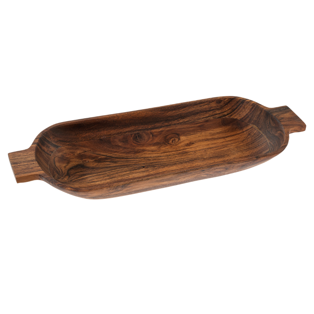 Sustainable acacia wood is elevated in the shaped Acacia Handled Tray. The elaborate wood grain makes every piece unique, creating a truly special serving dish for bread, produce, charcuterie and cheese. Food Safe. Hand Wash.