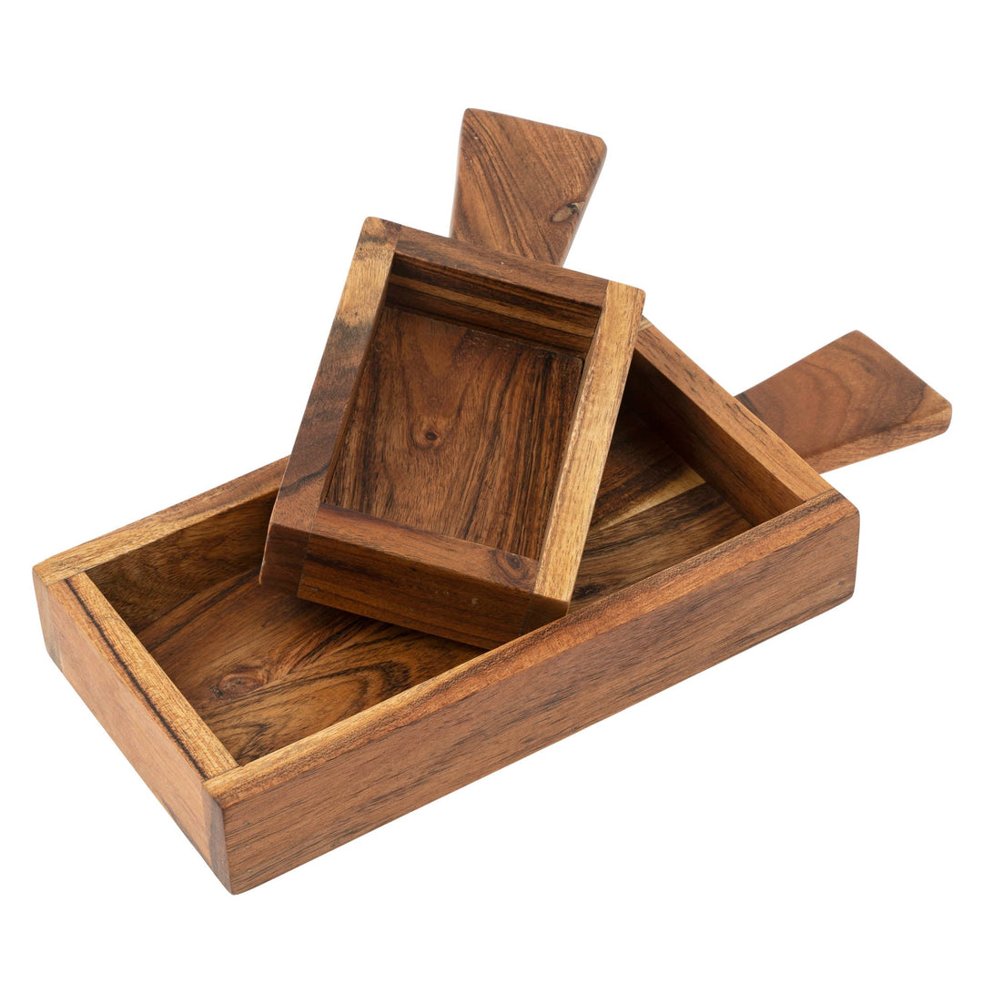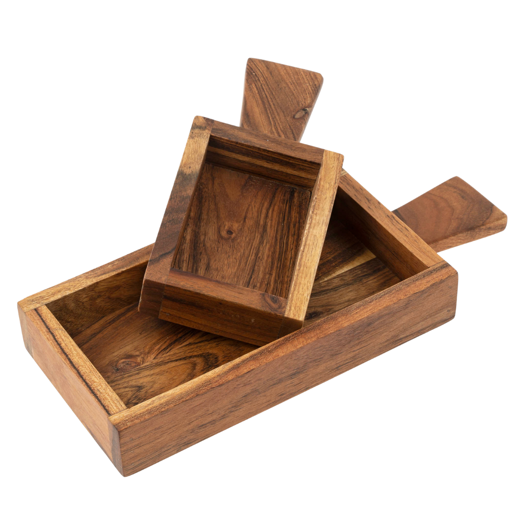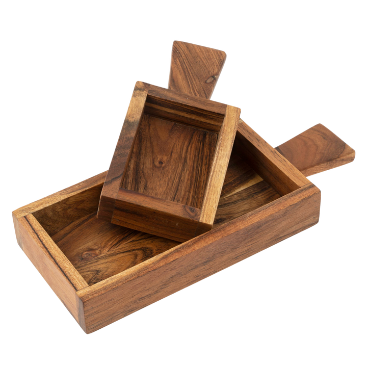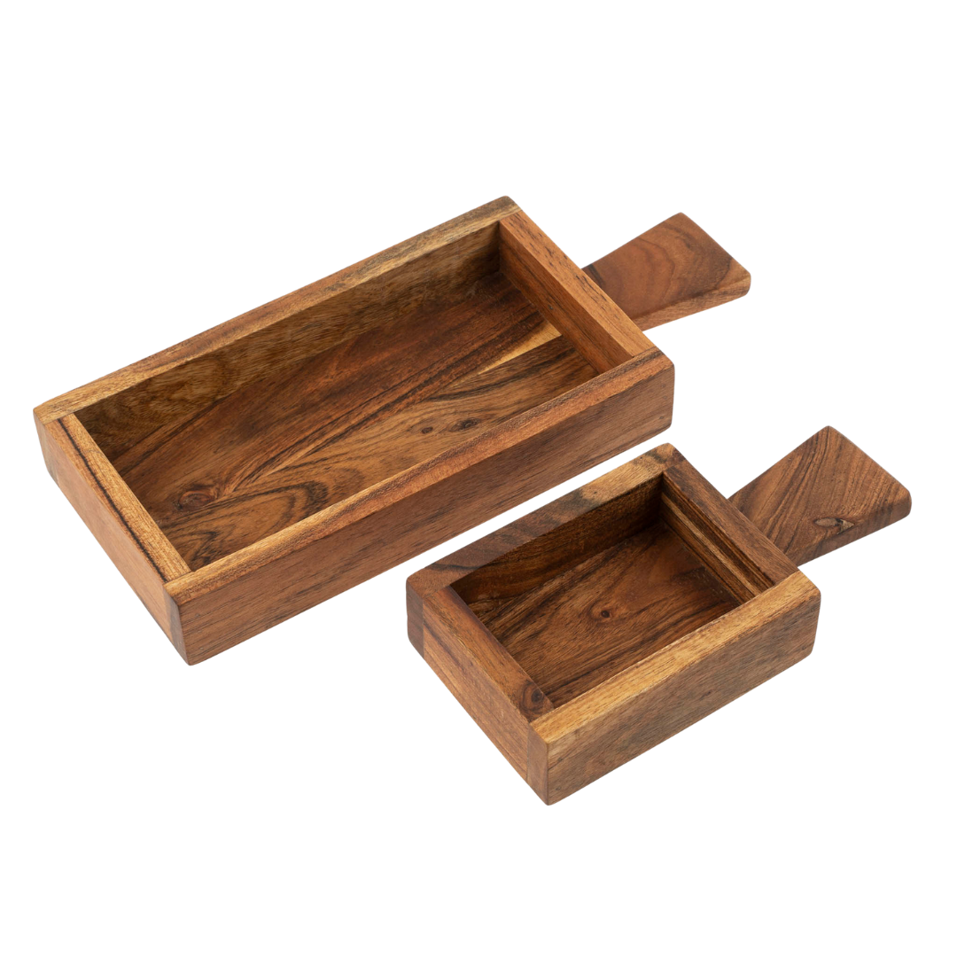 Handmade from sustainable acacia wood, the set of two Trove Trays has been finished with olive oil to make it truly eco-friendly. These edged trays have an angular handle and feel weighty in the hands. We like to use them to serve single servings of charcuterie, bread or baked goods. They multitask as grounding decor pieces on shelving or coffee tables, to collect change and keys by the front door or bedside, or as organizers on the bathroom vanity.