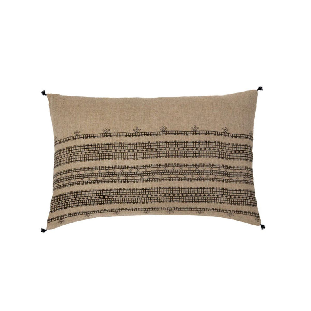 This Burley Pillow incorporates hand block-printing with a tribal inspired design. This intricate pattern with faint tassels can be a beautiful addition to any living space.