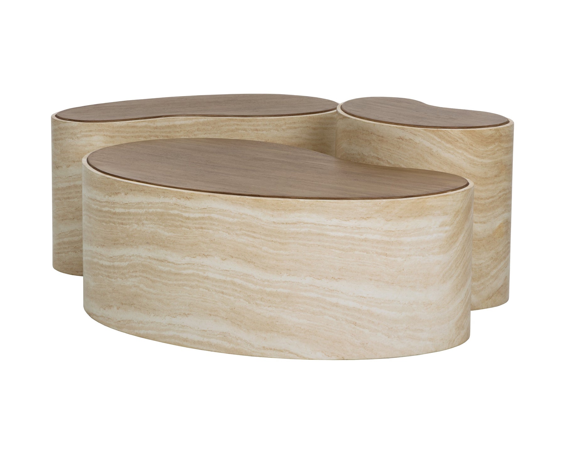 The Ishiko Coffee Table draws the eye with its sculptural, organic shape. Its gently curved, bean-like form is rendered in glass reinforced concrete, balancing the warmth of a light brown wood-effect top with the cool striations of a travertine-inspired base.