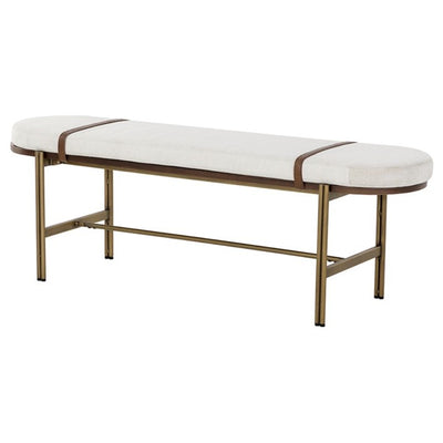 With a curved silhouette that features a rich mix of materials, this spectacular bench is a great addition to any space. Stocked in polo club muslin performance fabric with a walnut veener frame. Includes removable bravo cognac faux leather straps and completed with an antique brass steel base.