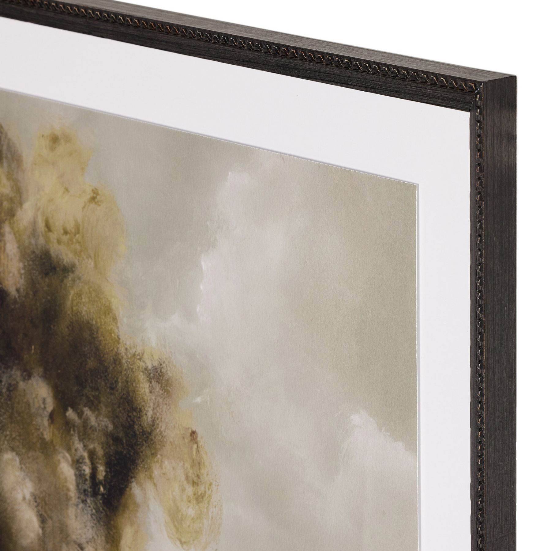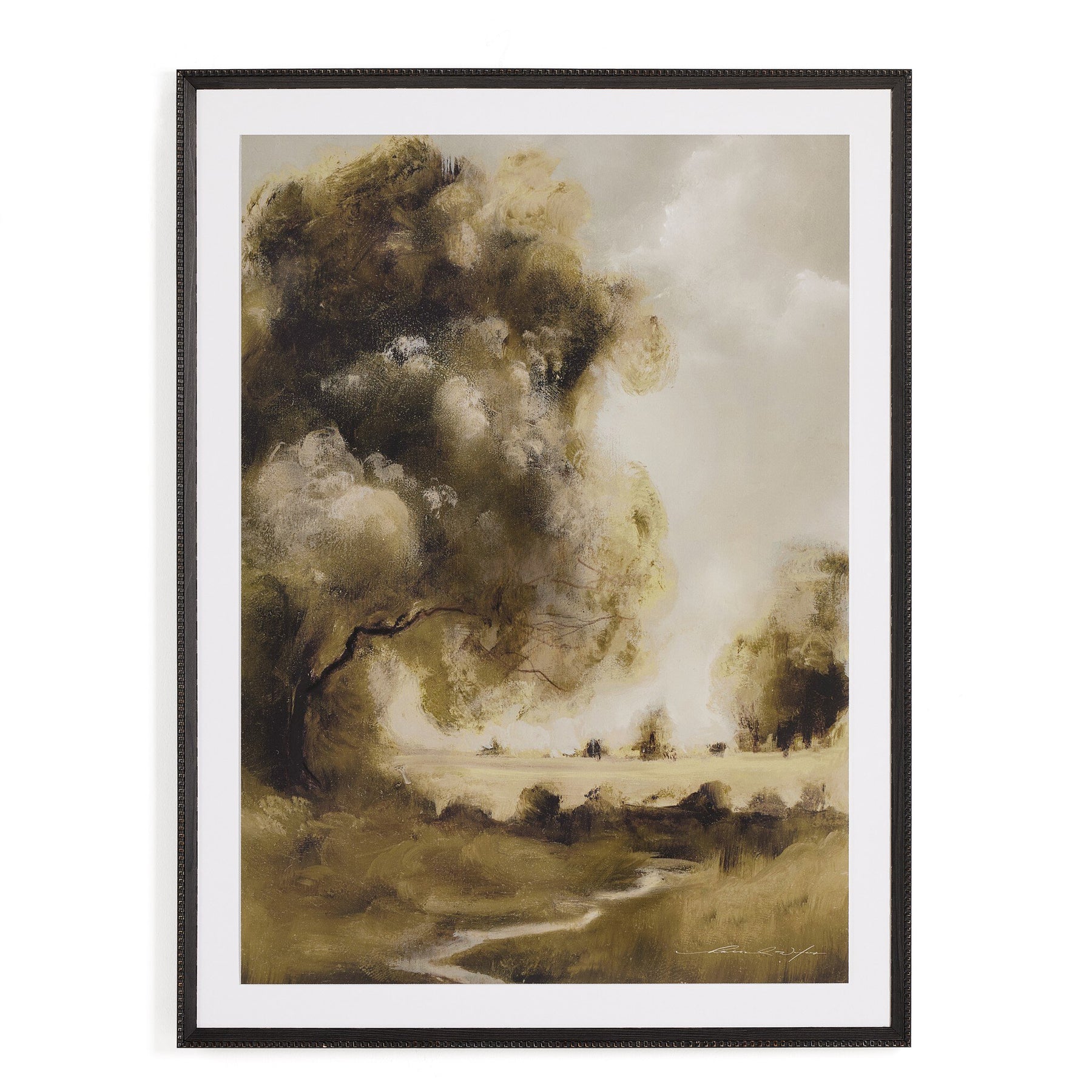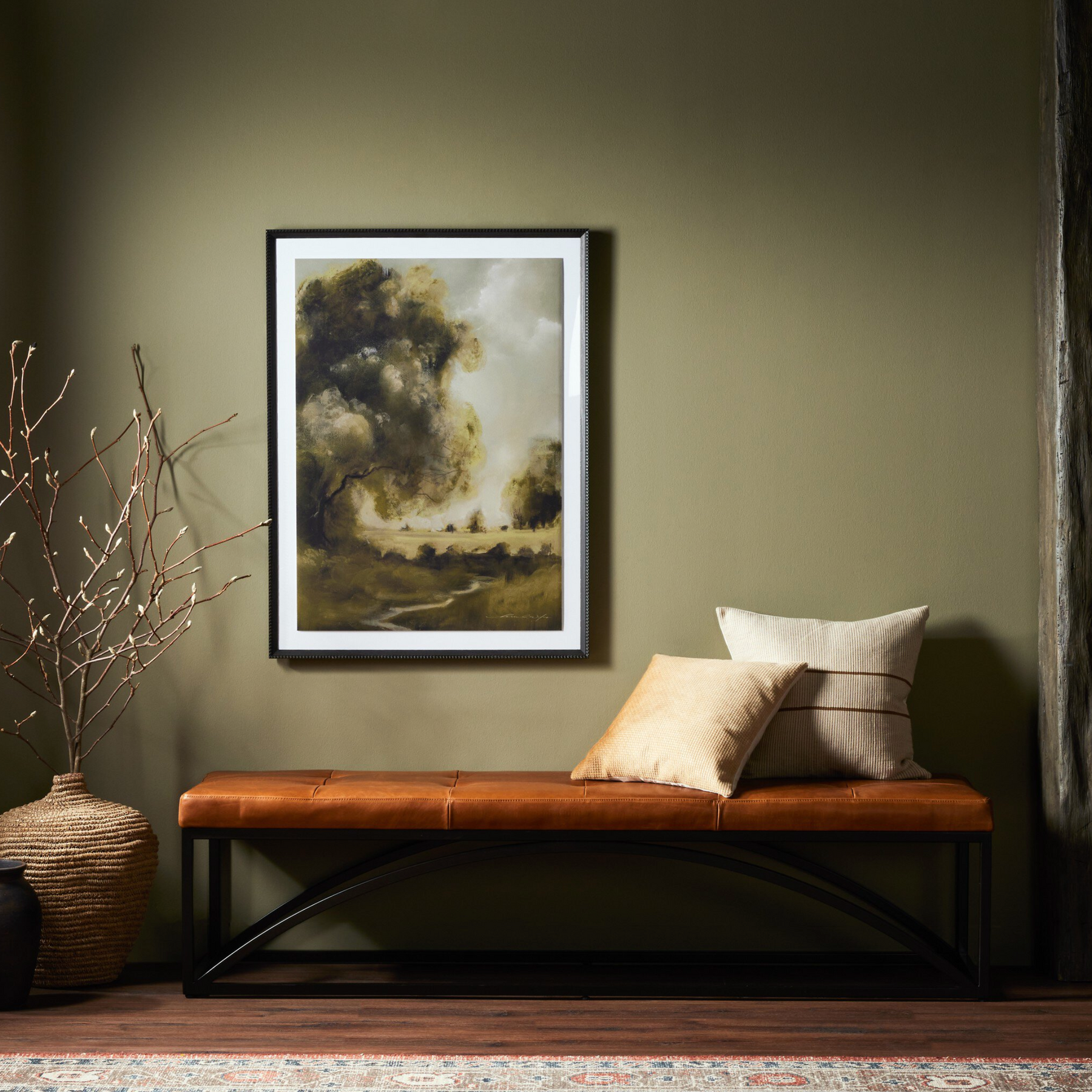 Alabama painter Hannah Winters finds inspiration in vintage landscapes, working with oil paint and an array of materials to texturize her ethereal pieces. Finished within a decorative Brimfield black frame of naturally distressed painted pine. Handmade in Austin, Texas.