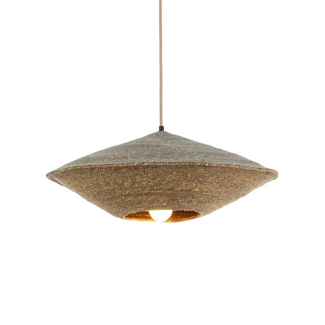 Handmade from woven seagrass, the Nest Pendant exudes beautiful natural texture and perfectly blends into any space. The top half has a subtle grey tone which gently contrasts the natural seagrass bottom. Laid back and cozy, this hardwired pendant casts a soft glow and comes with a 5” ceiling plate and a 59” adjustable cloth-wrapped cord in a complementary neutral tone. Features an E26 socket accommodating one bulb up to 9W LED or 40W incandescent.