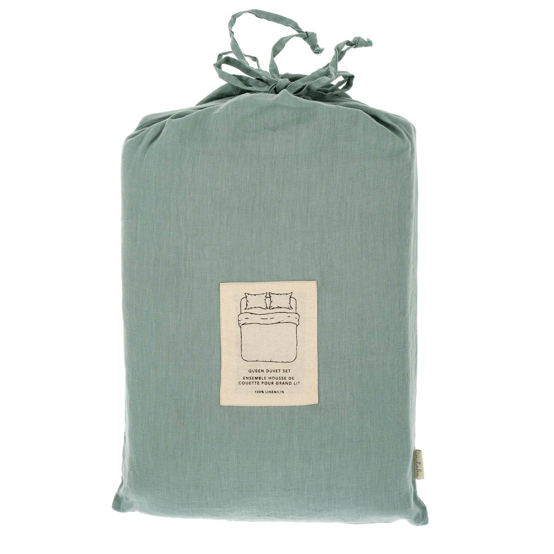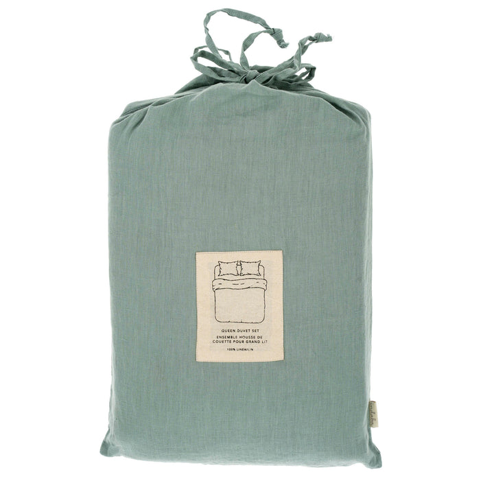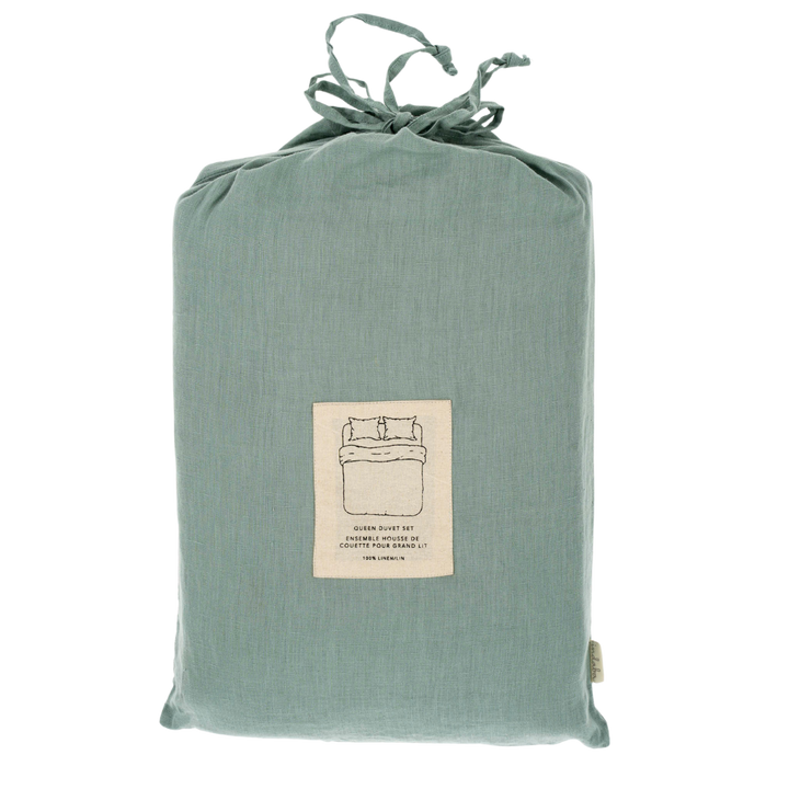 Our Reverie 100% 150 GSM linen duvet sets are expertly crafted in India from the highest quality European flax. The colors are saturated yet stonewashed for softness. The details are simple and lasting, and each set includes a duvet cover and two pillowcases, inside ties on all four corners, spare button, and matching linen bag. Pre-shrunk - 2-3% shrinkage may occur during first wash. Tested for colour-fastness. Machine wash - gentle cycle, tumble dry low, iron on low heat, do not dry clean.