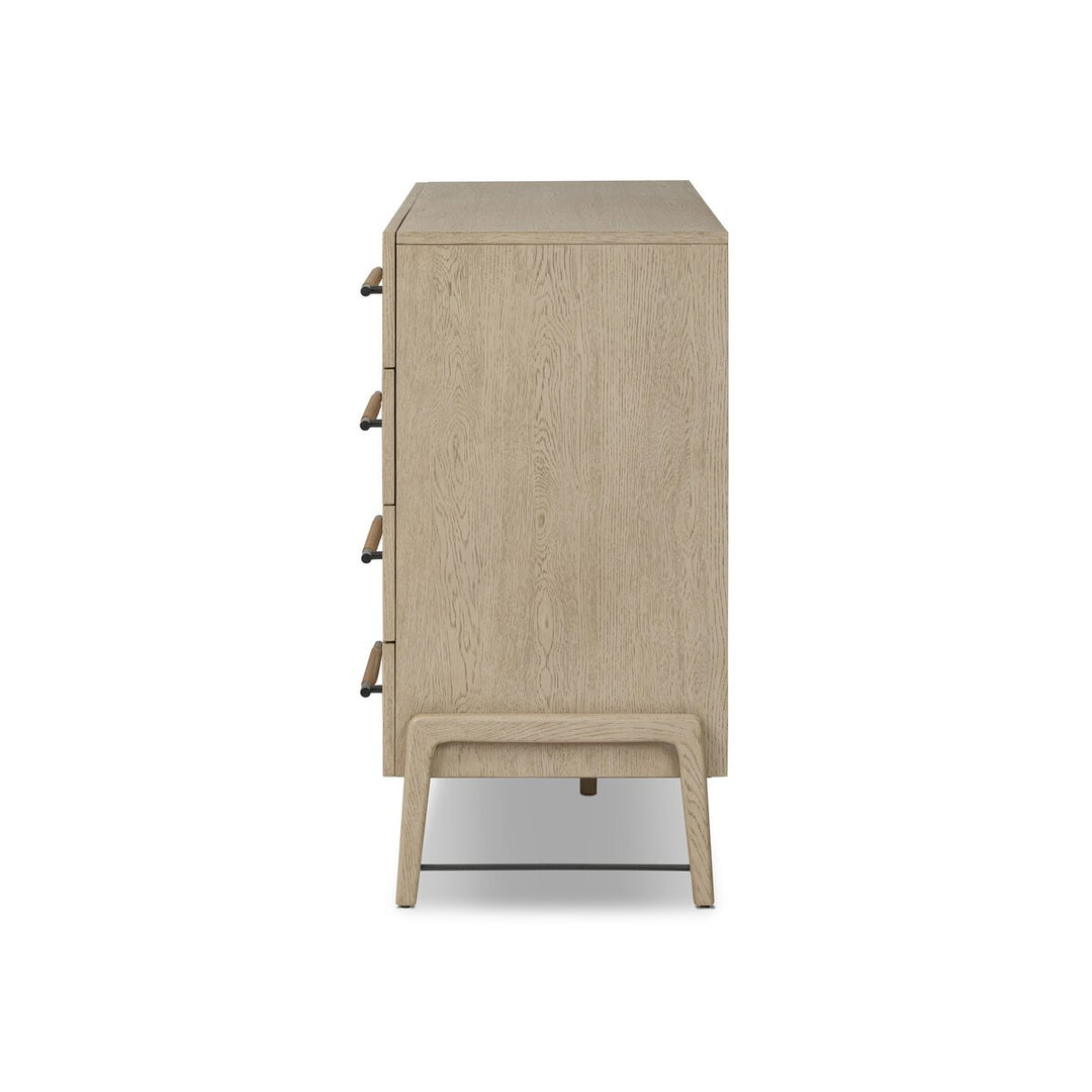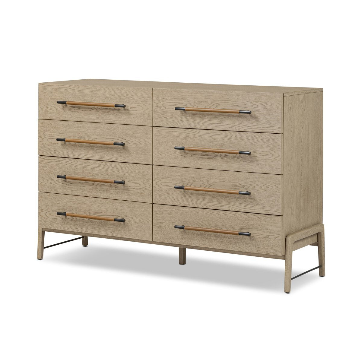 The Rosedale 8 Drawer Dresser exudes sophistication and elegance with its oak veneer and luxurious top grain leather construction. Organize your belongings in style with its eight spacious drawers. Elevate your bedroom with this premium piece that combines functionality and luxury.