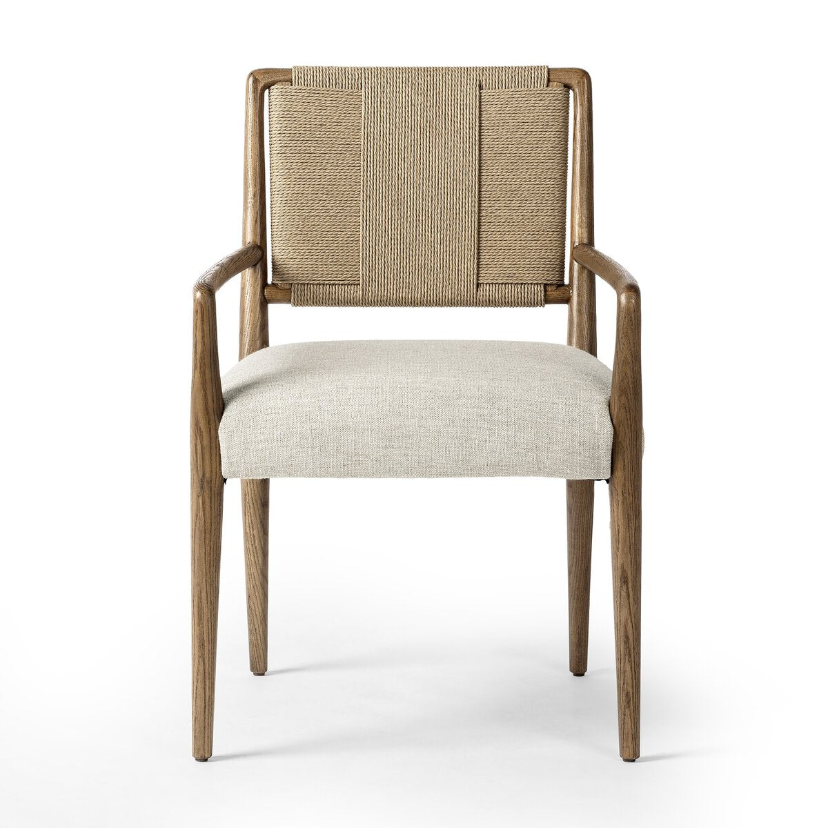 Mixed materials and patterns elevate the everyday dining chair. Alternating horizontal and vertical tone-on-tone weaving sections on the seat's back add visual interest, while the partially wrapped headrest frame feels organic and unexpected. A thick cushioned seat upholstered in performance fabric is comfortable and pragmatic. Performance fabrics are specially created to withstand spills, stains, high traffic and wear, ensuring long-term comfort and unmatched durability.