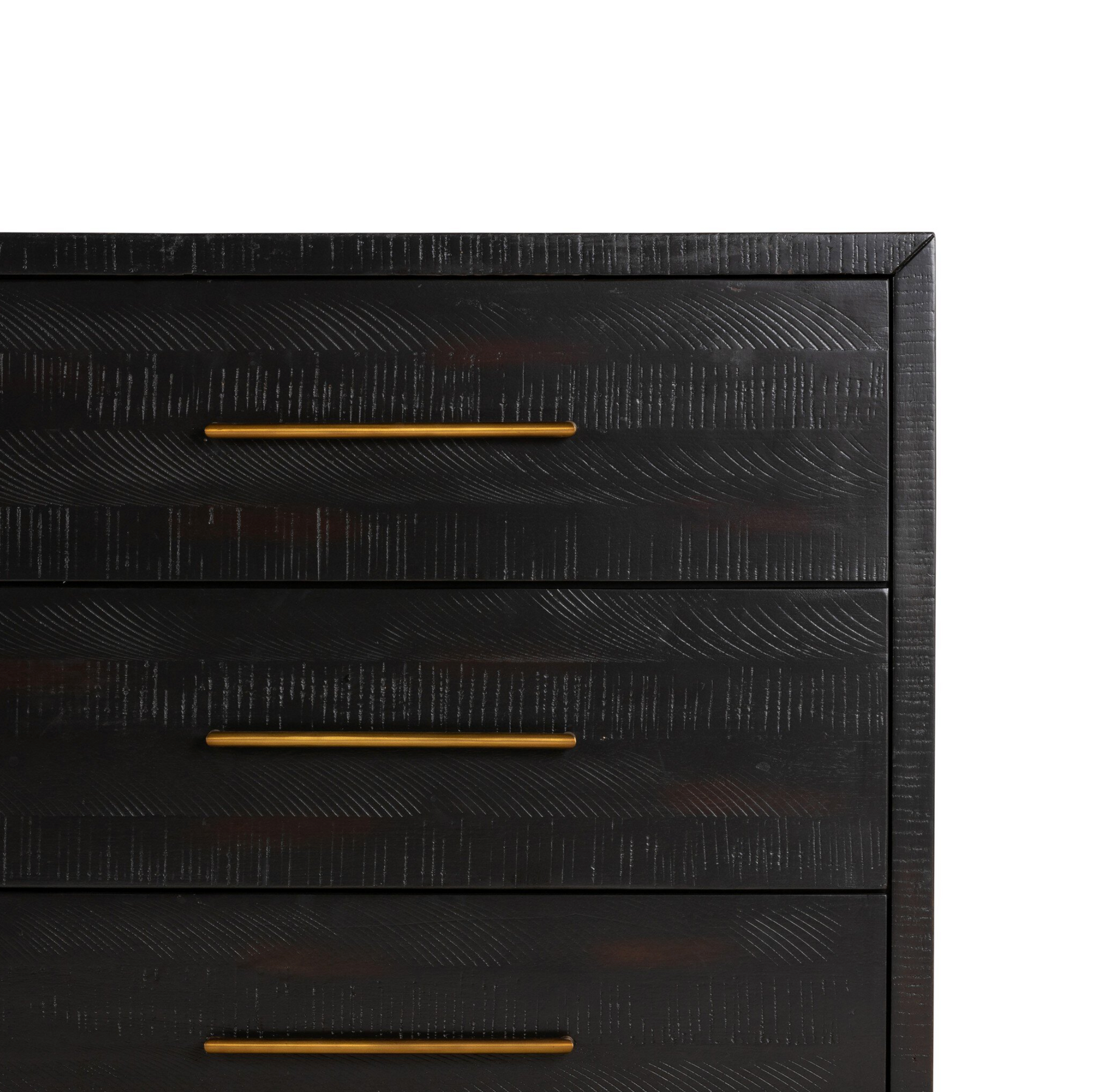 Simple sophistication with a modern edge. Clean lines lighten the natural depth of a burnished black finish. Brass-finished hardware adds a sleek touch to six spacious drawers.