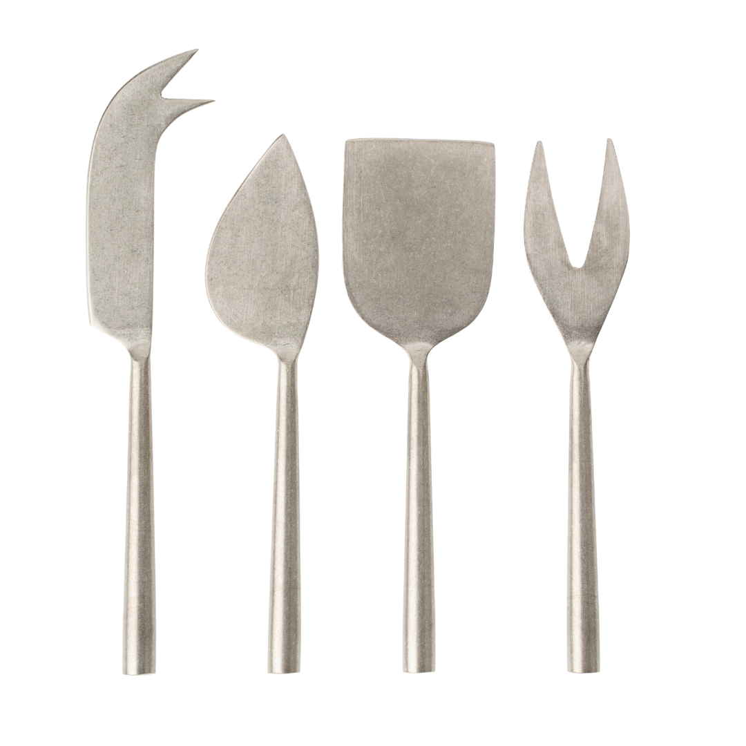 Hand forged in Moradabad, a city in India known for metal craftsmanship, our Tides Cheese Knives are a testament to timeless quality. Hand-forged from stainless steel, these servers boast a distinctive distressed matte silver finish that proudly bears the authentic marks of their skilled makers. Elevate cheese plates and charcuterie plates with especially designed utensils. Each box includes a pronged cheese knife, spatula knife, flat cheese knife and cheese fork ranging in size from 6.25" to 7.5". Hand wash recommended.